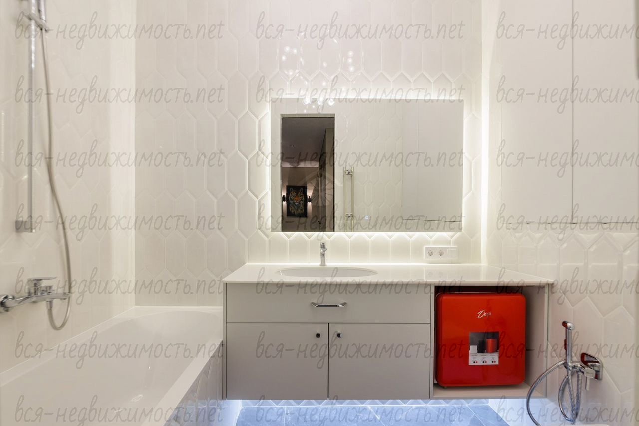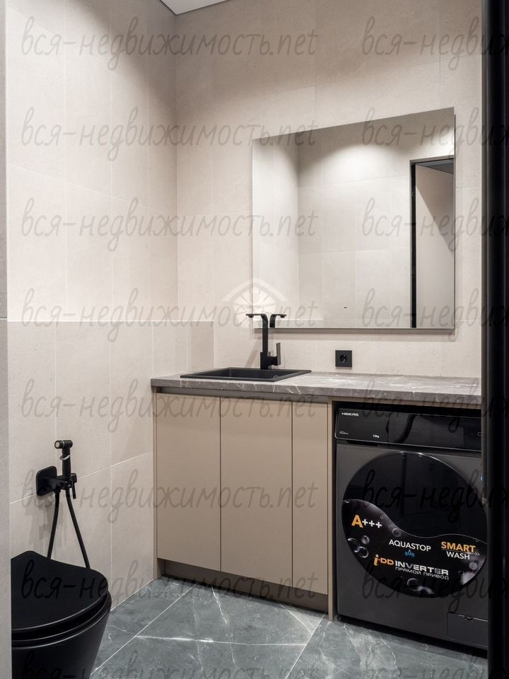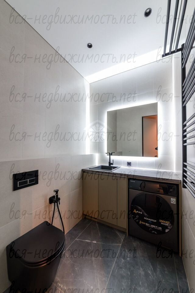 В квартире 2 санузла. Один оборудован сантехникой Villeroy&Boch, холодильником для косметики и напитков, большой системой хранения. Во втором санузле высокотехнологичная стиральная машина, хозяйственная зона с удобным хранением инвентаря и средств для уборки.