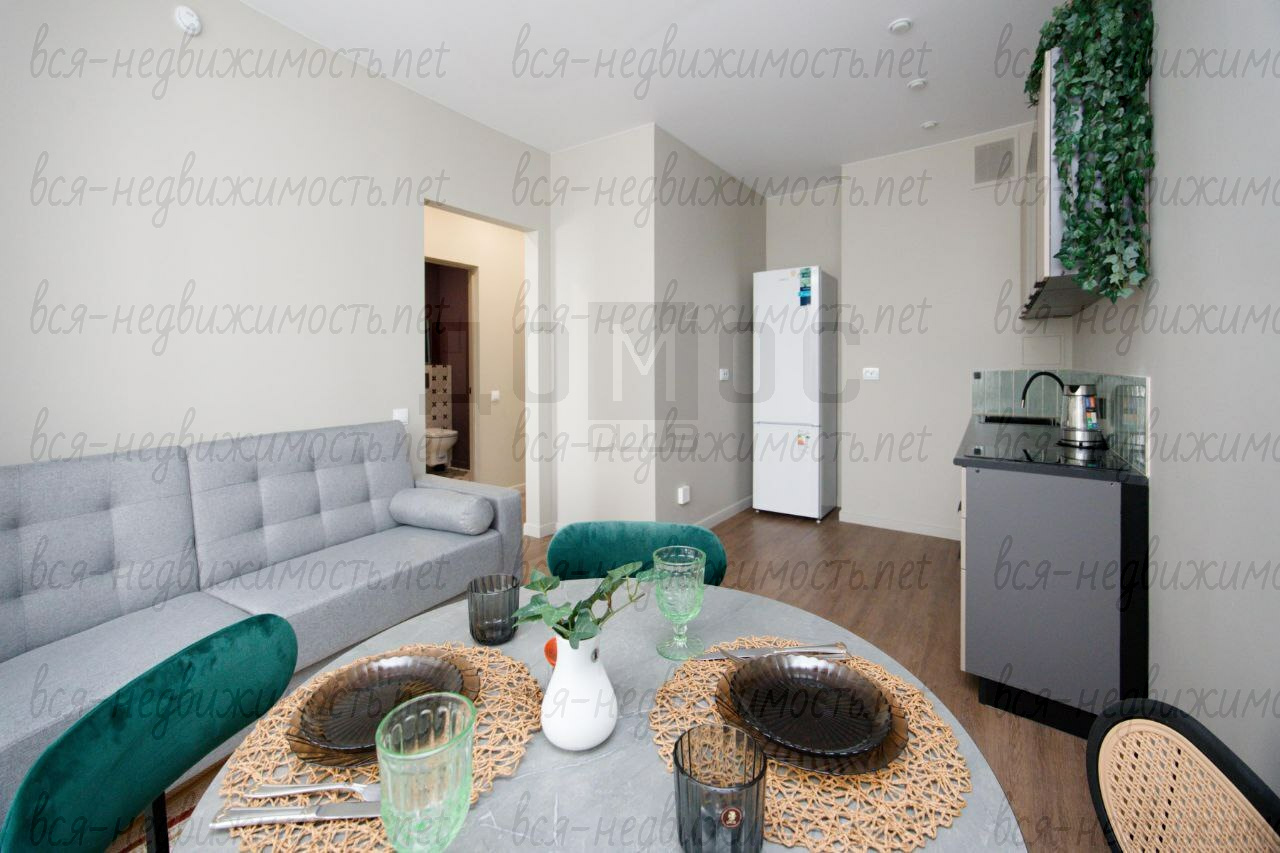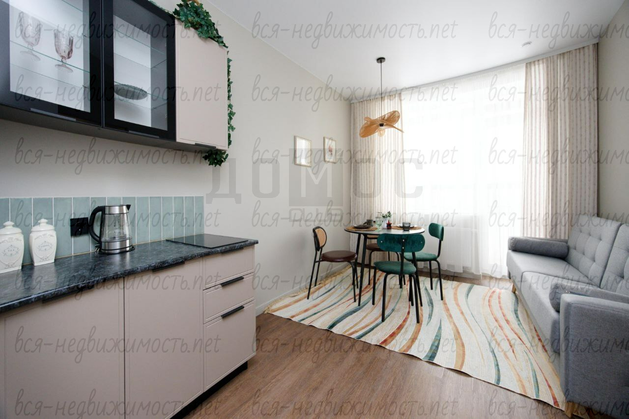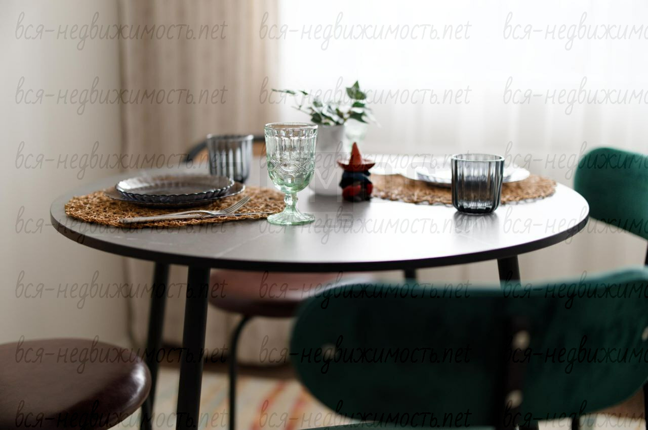 - Гостиная-кухня:Просторная светлая зона. Кухня полностью укомплектована новой техникой (индукционная плита, холодильник, чайник). Особый шарм зоне отдыха придают изумрудные бархатные кресла, дизайнерский деревянный светильник и теплый текстиль.