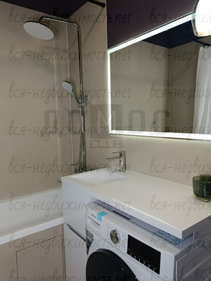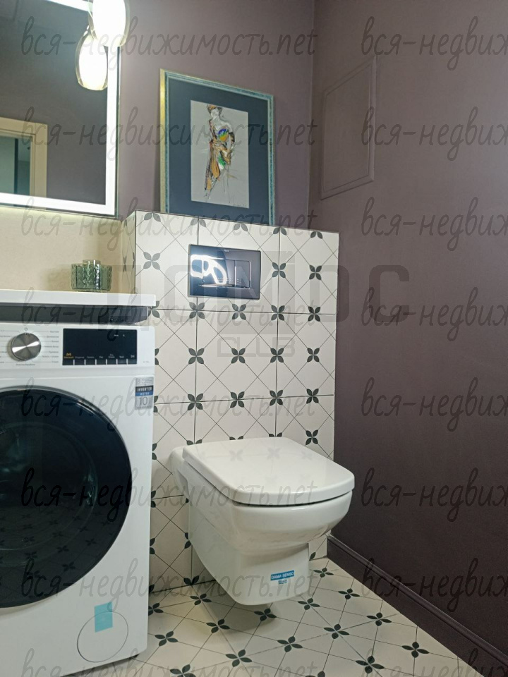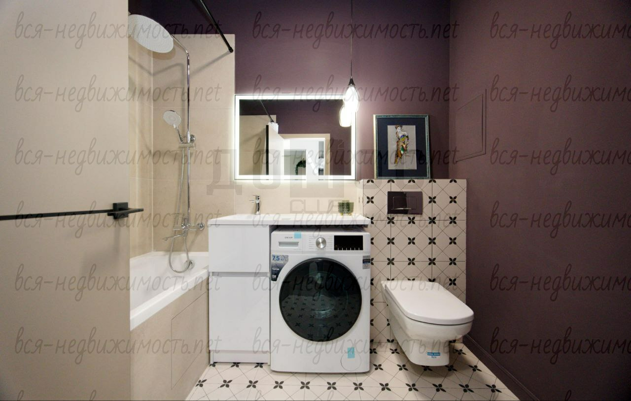 - Ванная комната:Отделана с особым вкусом. Глубокий сливовый акцент, стильная плитка с геометрическим принтом, современная сантехника и зеркало с подсветкой превращают утренние сборы в ритуал. Стиральная машина эргономично встроена в гарнитур.