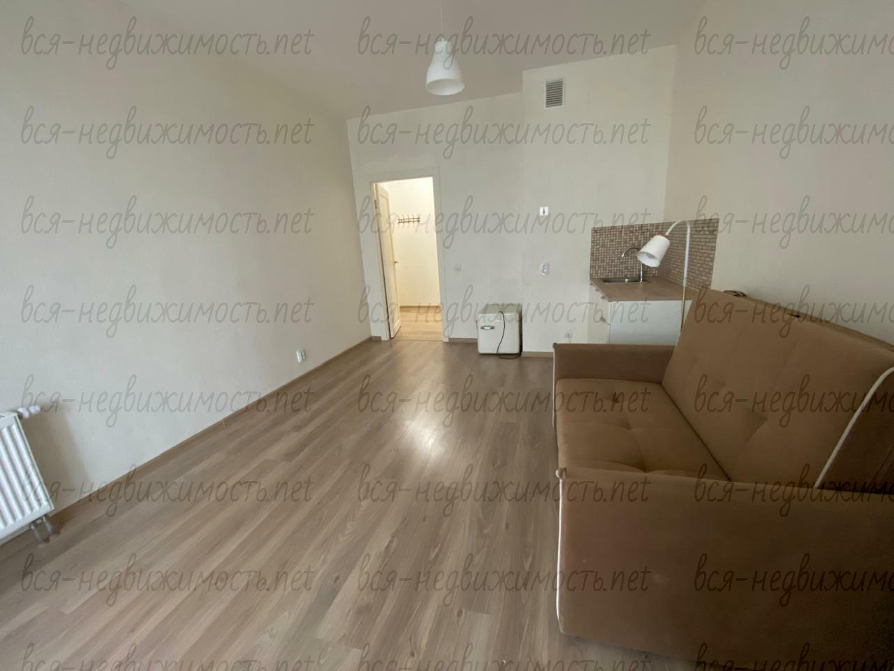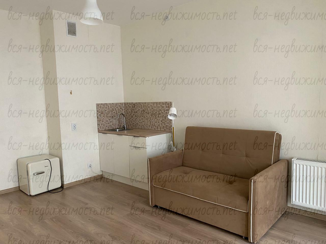 В квартире есть небольшая кухня, холодильник, диван. Совмещенные туалет и ванная, установлена стиральная машина.