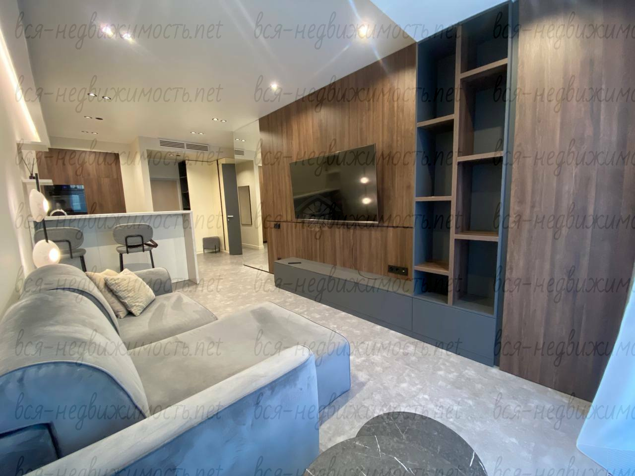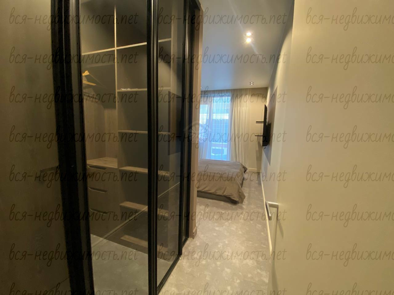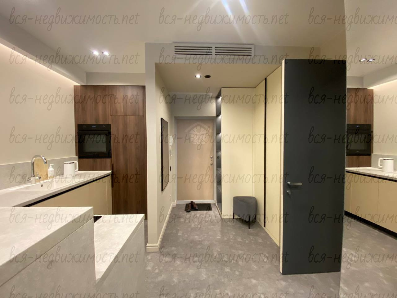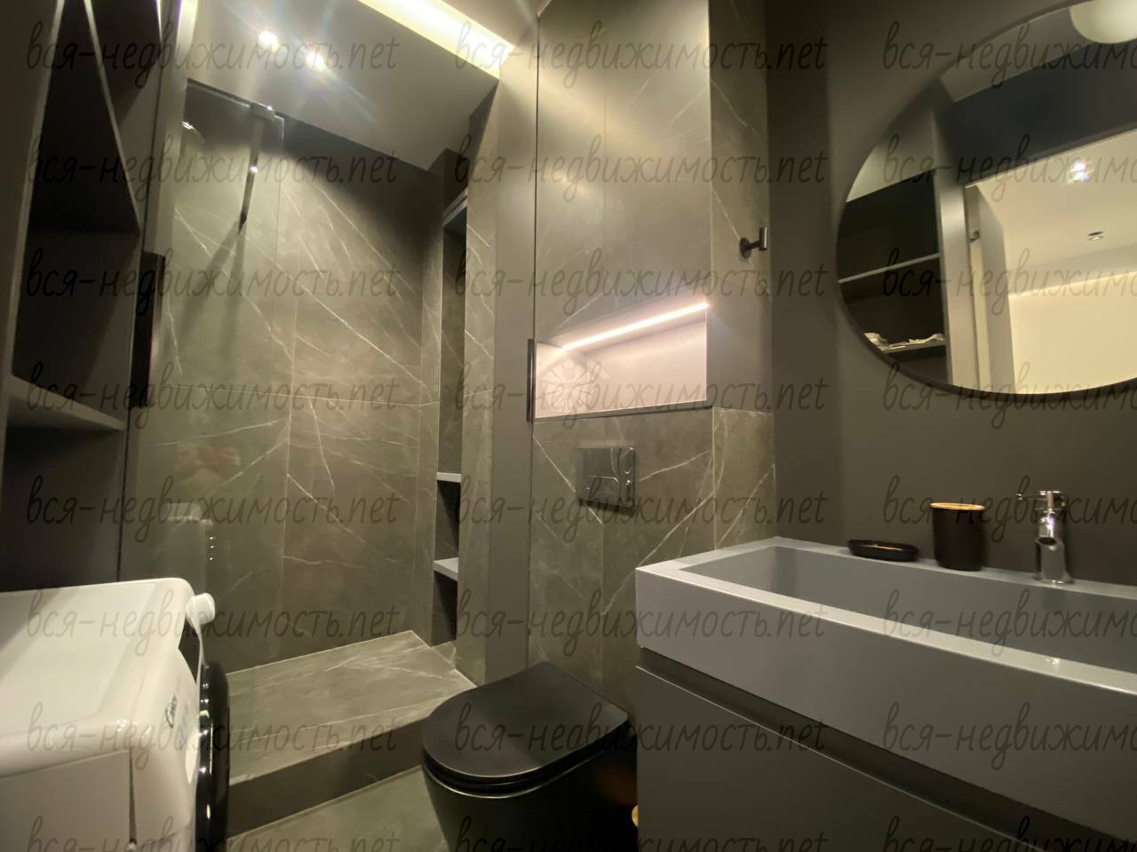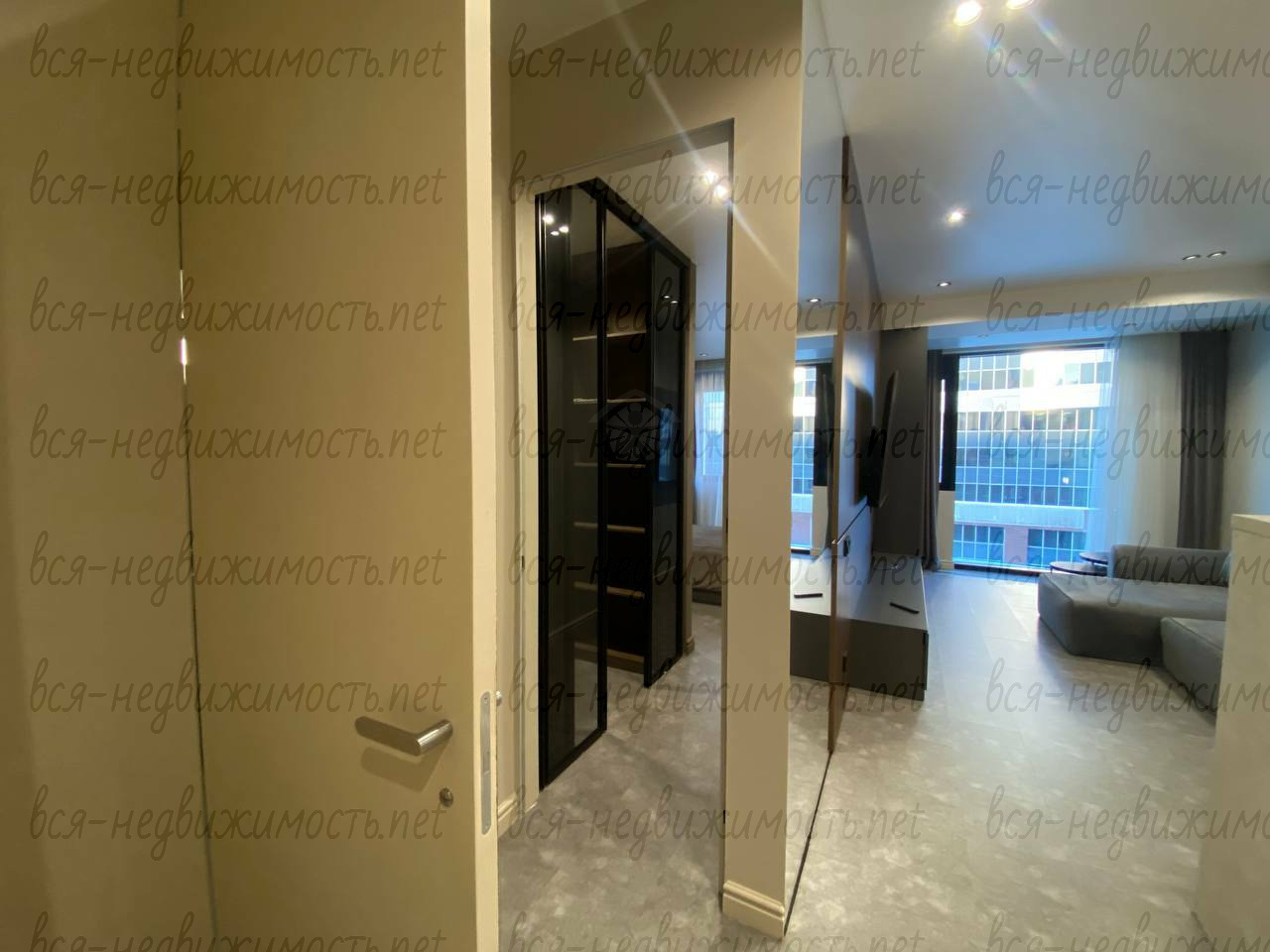 Вся необходимая мебель и техника имеется (холодильник, стиральная машина, плита, вытяжка, кондиционер, телевизор), встроенная кухня, большая система хранения, гардеробная.
