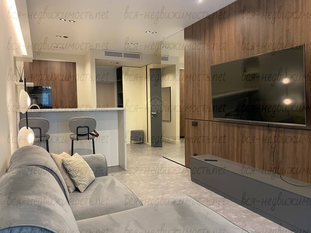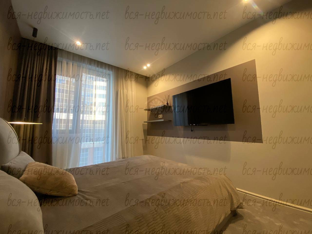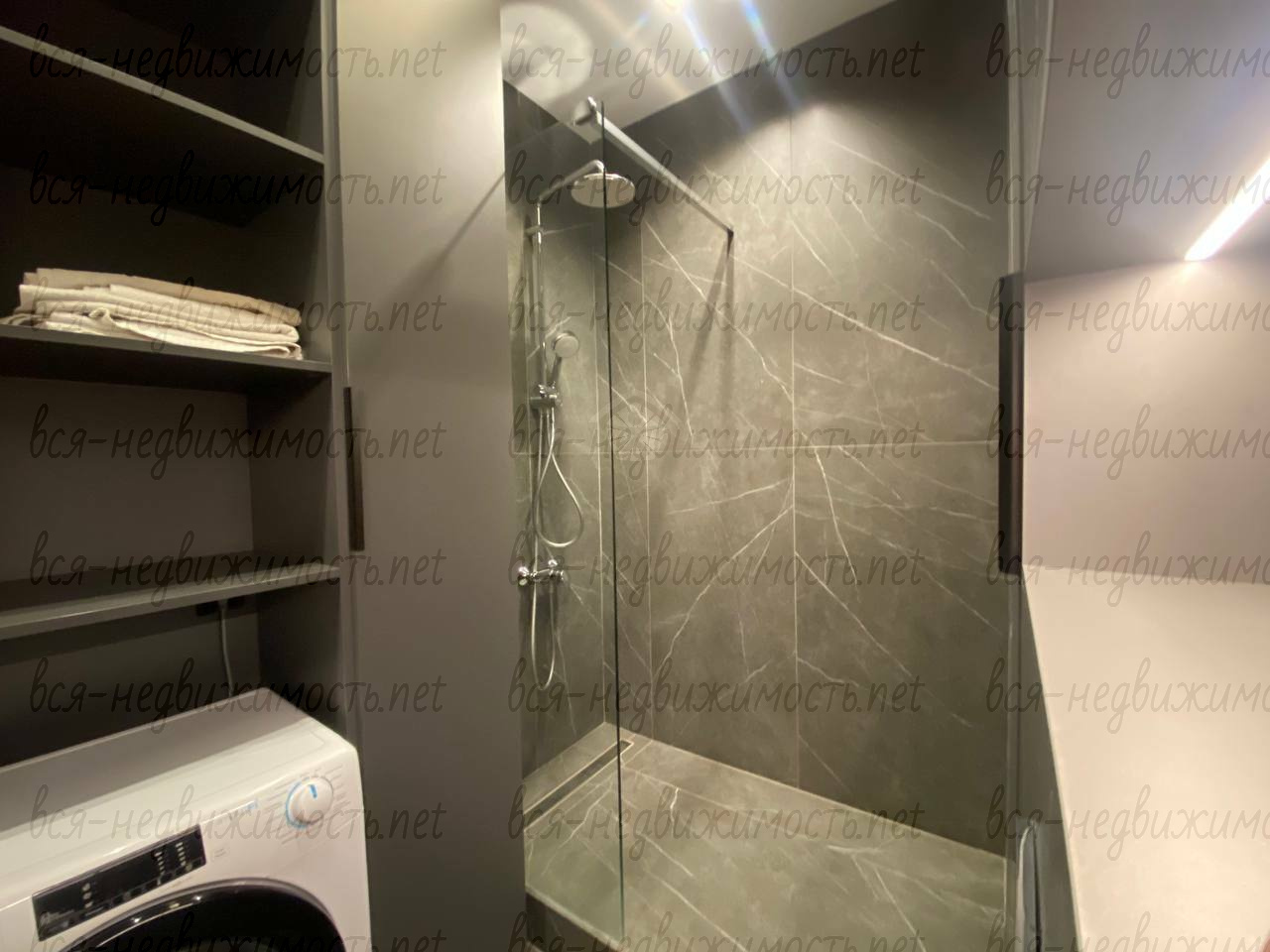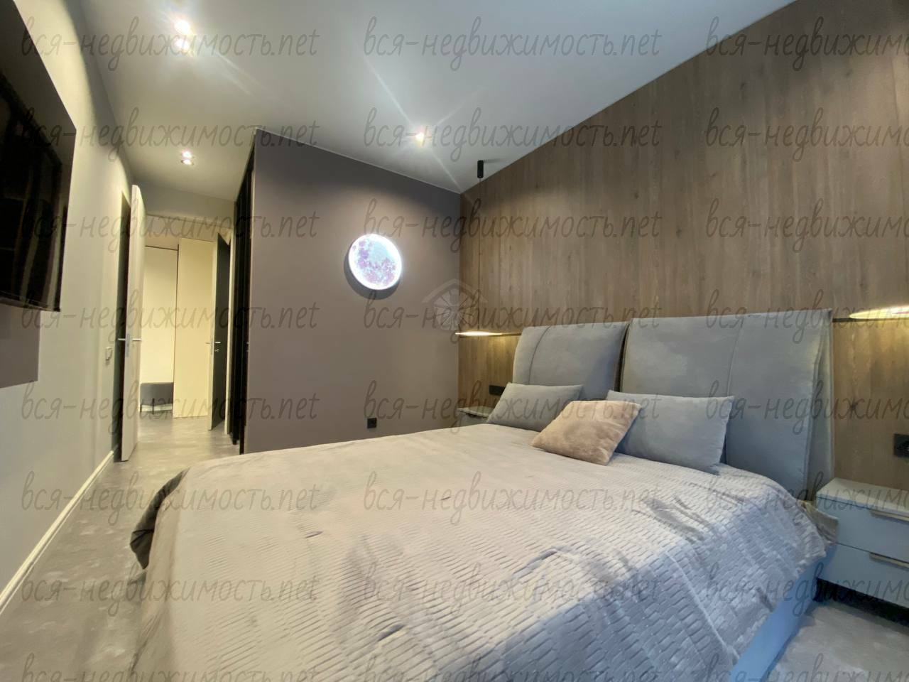 Вся необходимая мебель и техника имеется (холодильник, стиральная машина, плита, вытяжка, кондиционер, телевизор), встроенная кухня, большая система хранения, гардеробная.