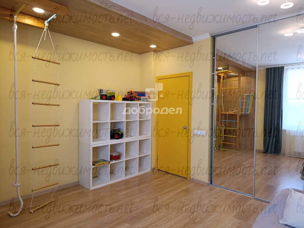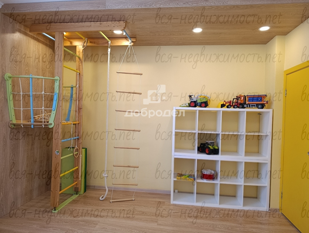 в детской установлен игровой уголок, диван, стол, большой шкаф.