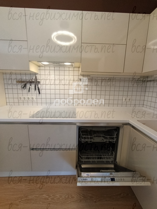 на кухне: дорогой кухонный гарнитур со встроенной мебелью и посудомоечной машиной,