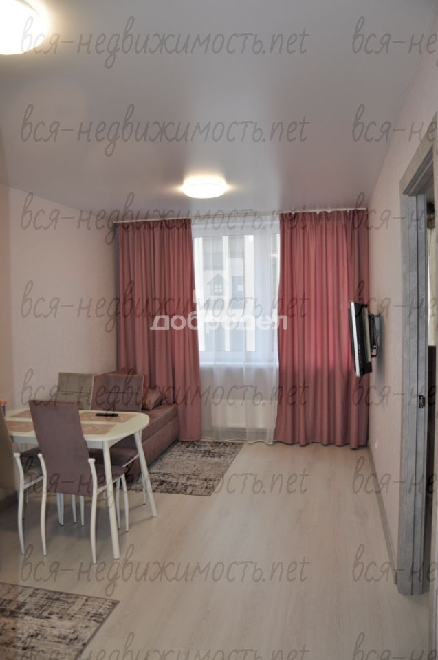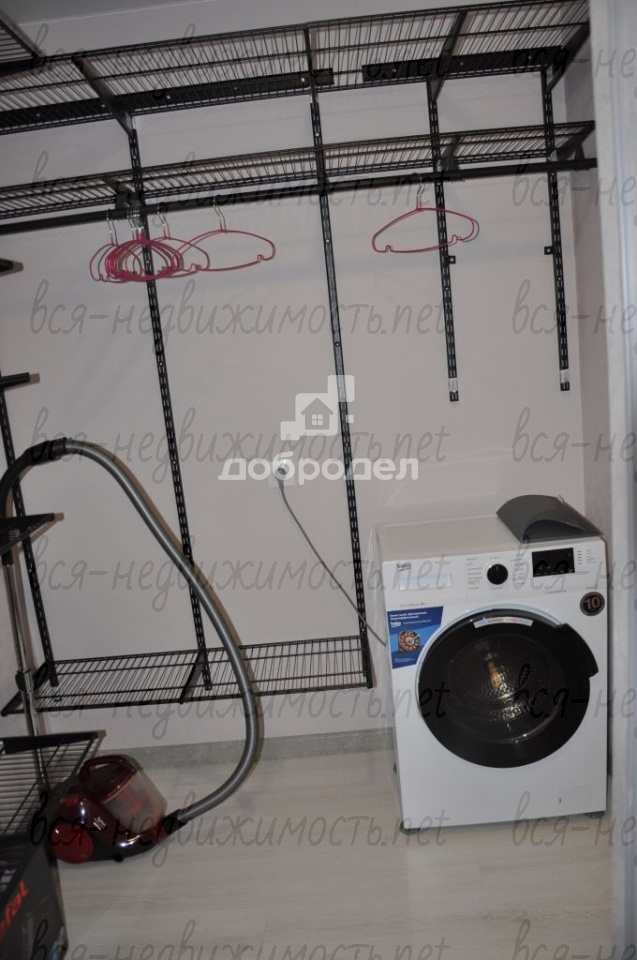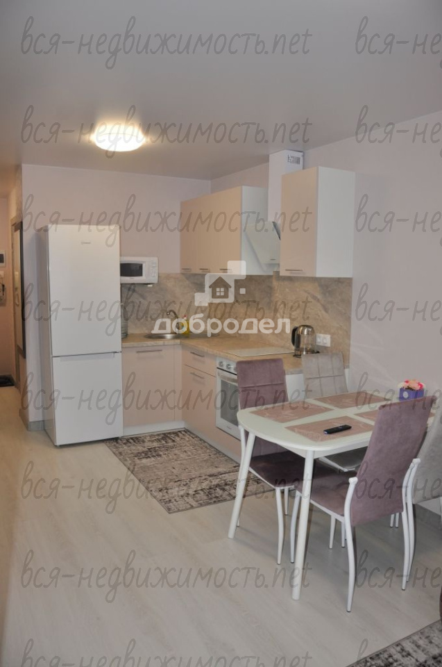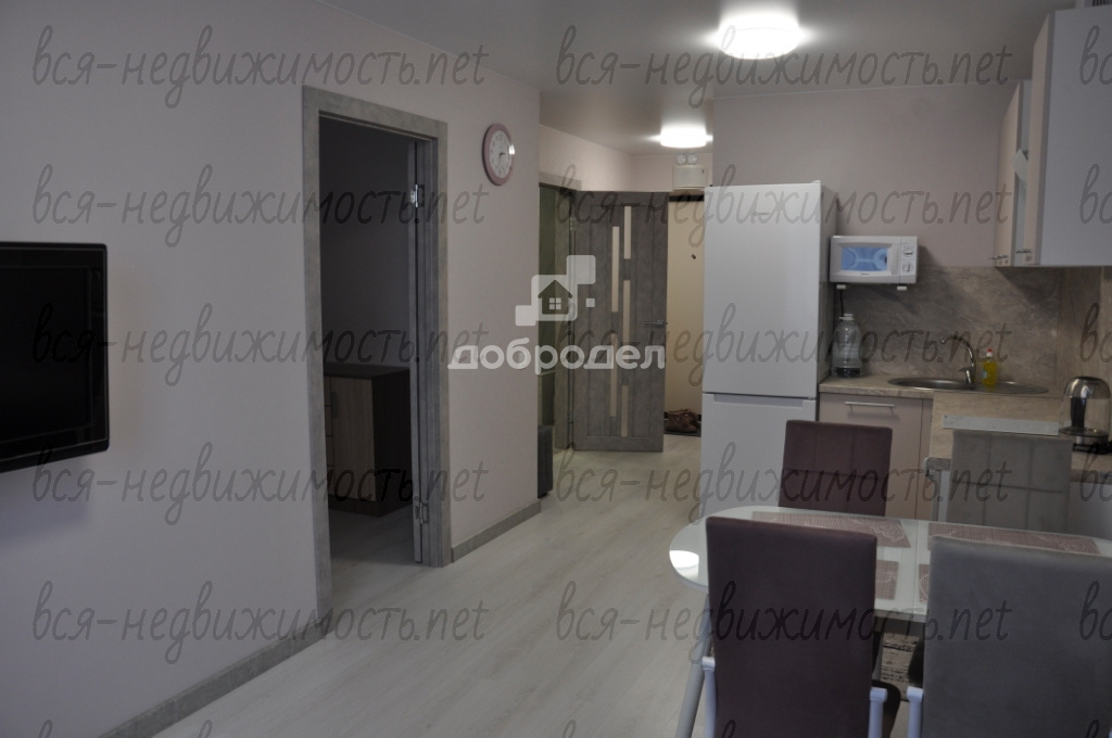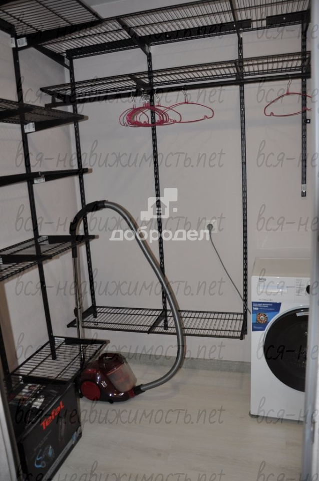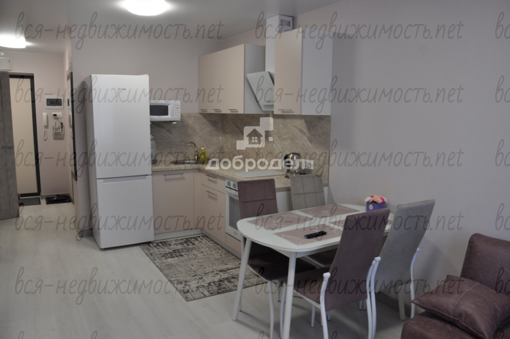 Есть вся необходимая мебель и техника: вместительная гардеробная-постирочная, там установлена стиральная машинка и хранится мелкая бытовая техника: пылесос, утюг и т.п., на кухне раскладывающийся диван, кухонный гарнитур со встроенным духовым шкафом и варочной поверхностью, холодильник, вытяжка, микроволновка, обеденный стол, телевизор! В комнате диван-кровать и комод!