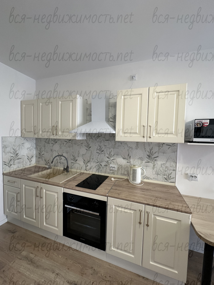 - Кухня-гостиная: современный кухонный гарнитур, электрическая варочная панель и духовой шкаф (Indesit), вытяжка (Weissgauff), холодильник Indesit No Frost, микроволновая печь, чайник, обеденный стол и 3 стула. Есть удобный диван-еврокнижка, телевизор.