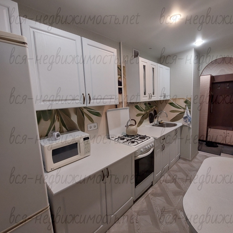 В квартире есть вся необходимая мебель и техника: кухонный гарнитур, плита, холодильник, микроволновая печь, обеденный стол, двуспальная кровать, шкафы для хранения, диван, телевизор, стиральная машина. Много мест для хранения вещей. Чистый подъезд, спокойные соседи.