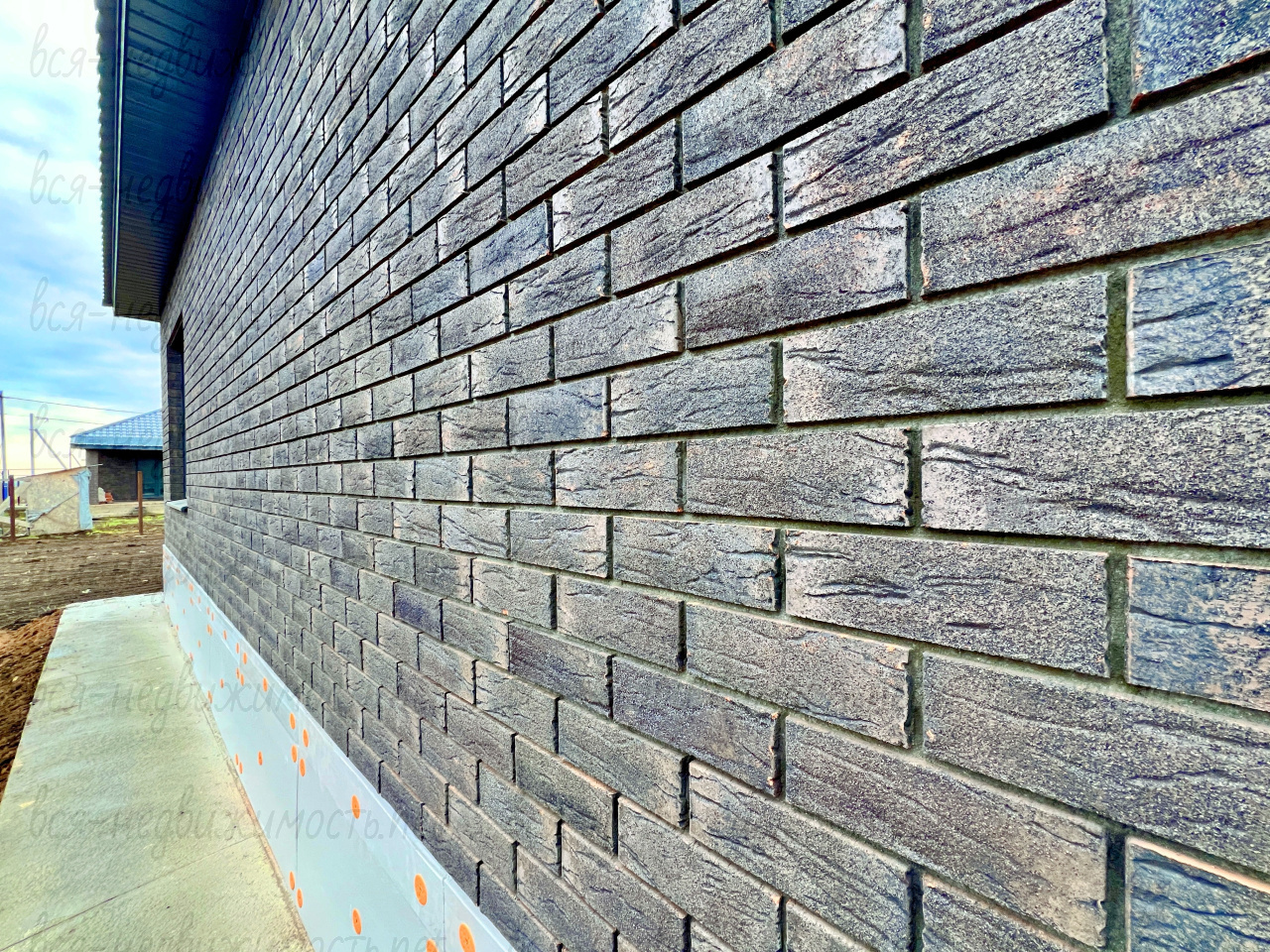 Стены: керамзитоблок 20 см, утеплитель 10 см, облицовочный кирпич, дорожка до крыльца, отмостка