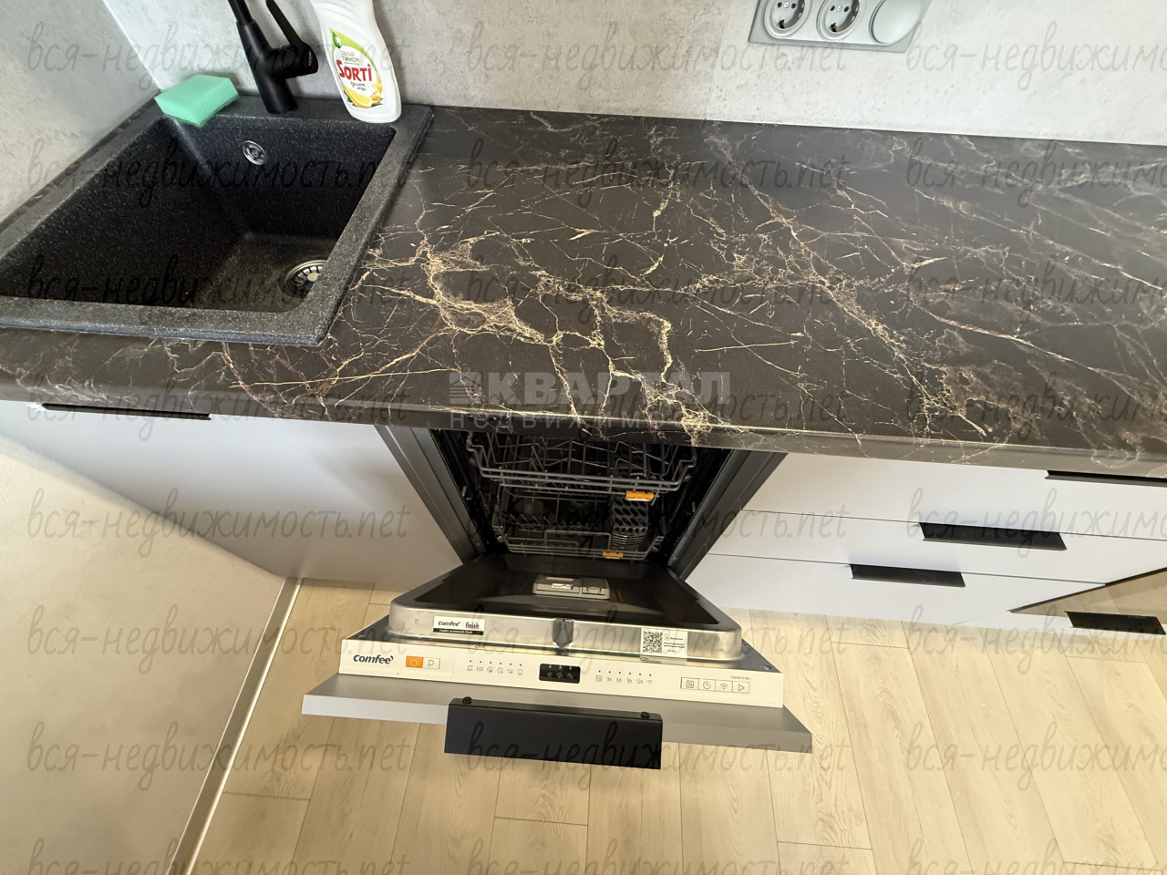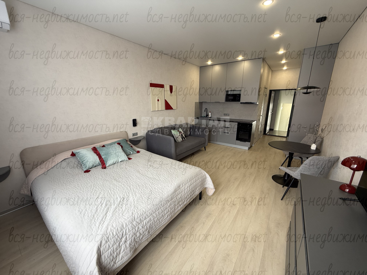 Квартира-студия находится на 5 этаже , 1 совмещенный санузел, кухня, хороший ремонт, техника, микроволновая печь, духовка, холодильник вся техника встроенная.