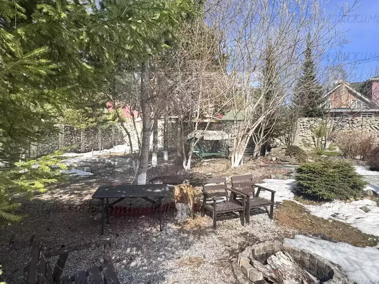 Теплая беседка с мангальной зоной, где расположен пруд и качели.