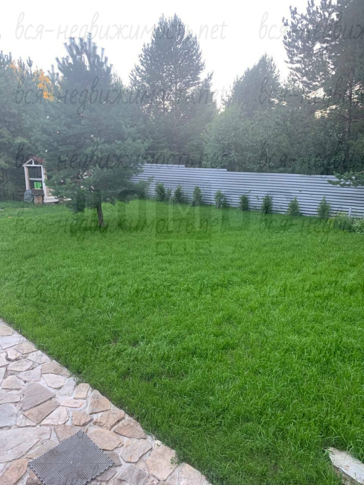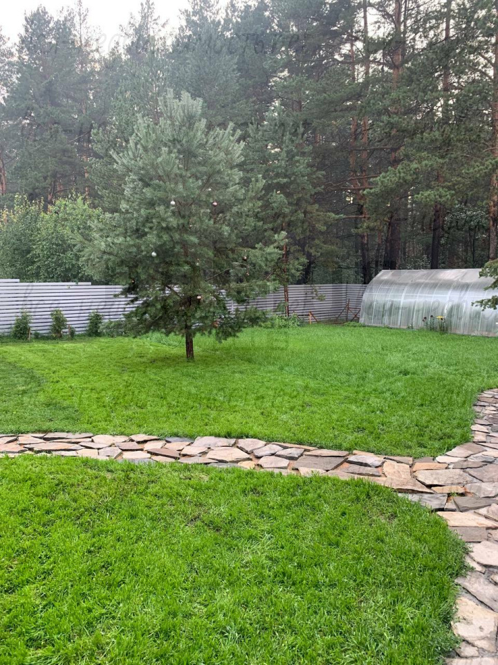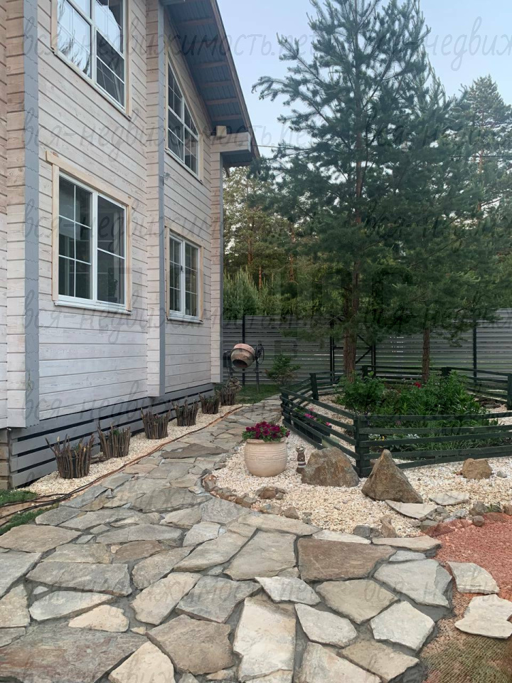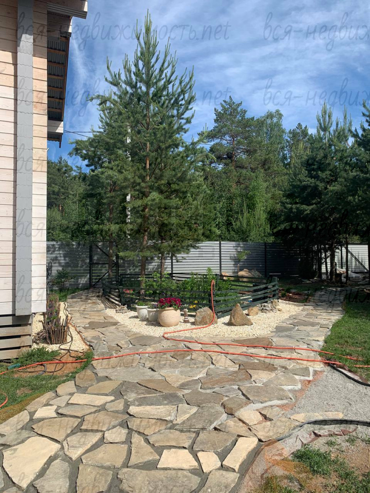 - Ландшафт: Ровный газон, свои сосны, дорожки из натурального плитняка;