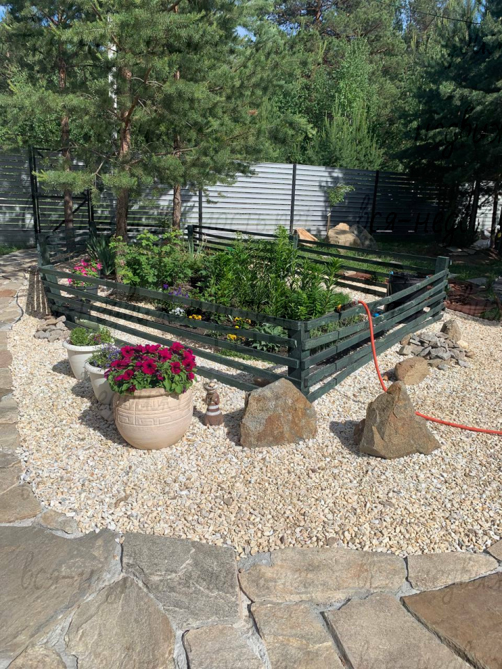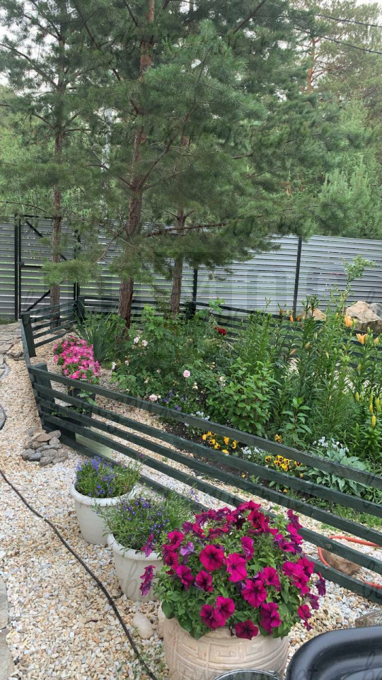 - Забор из евроштакетника (цвет Ral 7004) — стильно и аккуратно;