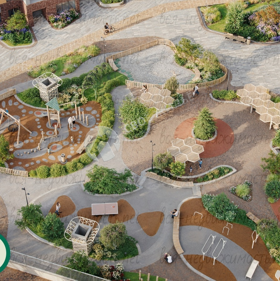 Дизайнерское лобби, закрытый двор-парк без машин, детский игровой комплекс с безопасным покрытием, подземный паркинг на 227 машино-мест.