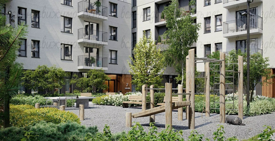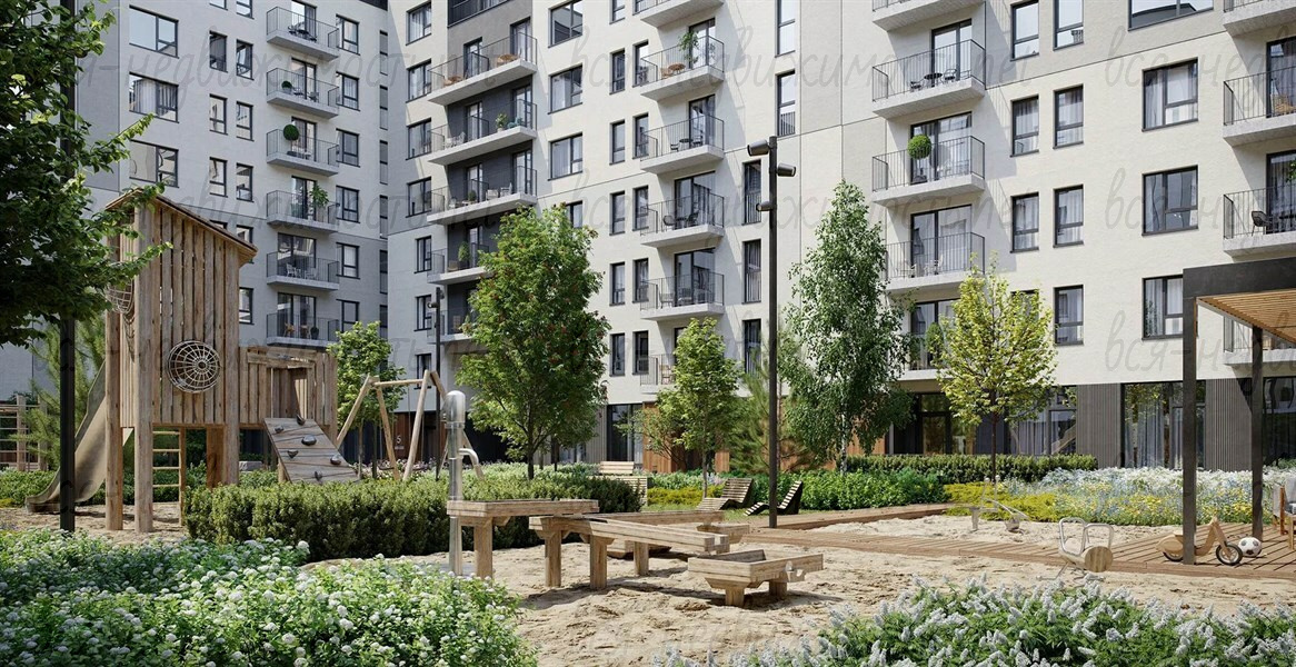 Первые три дома проекта представляют собой замкнутые кварталы переменной высотности. В двух из них спроектированы секции-доминанты. Основной архитектурный объём в 8-9 этажей позволяет сформировать гуманную, не давящую на человека среду. Фасад каждого дома первой очереди имеет акцентную секцию, облицованную композитными панелями.