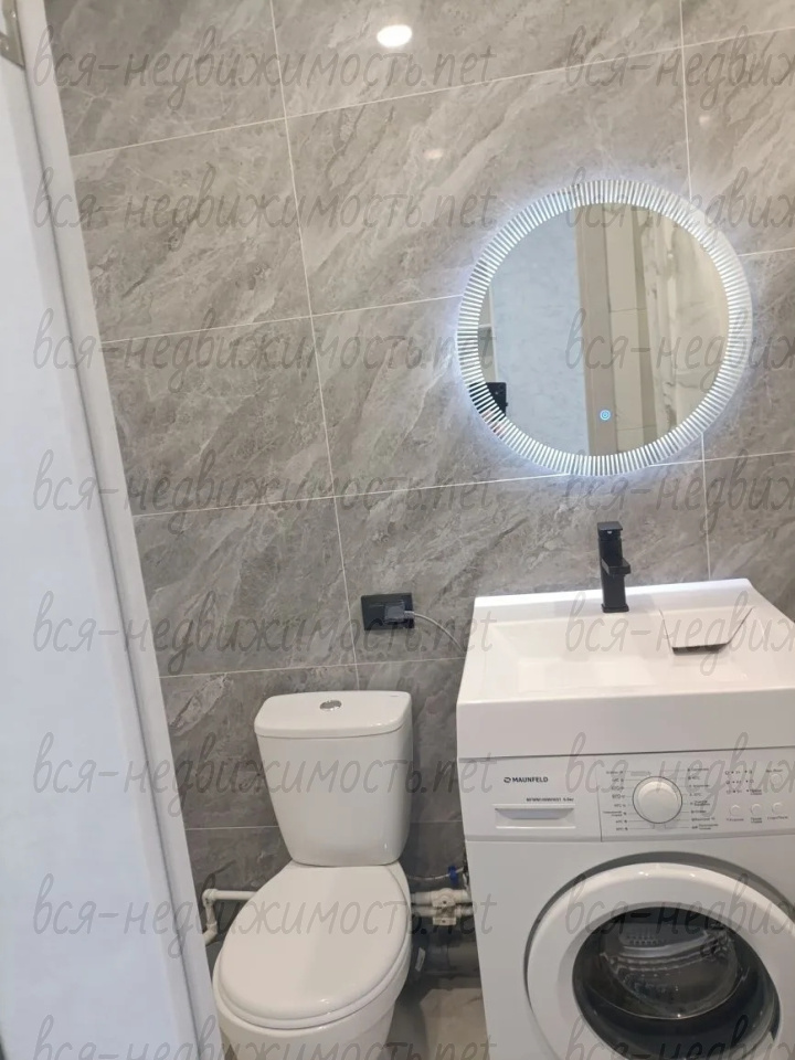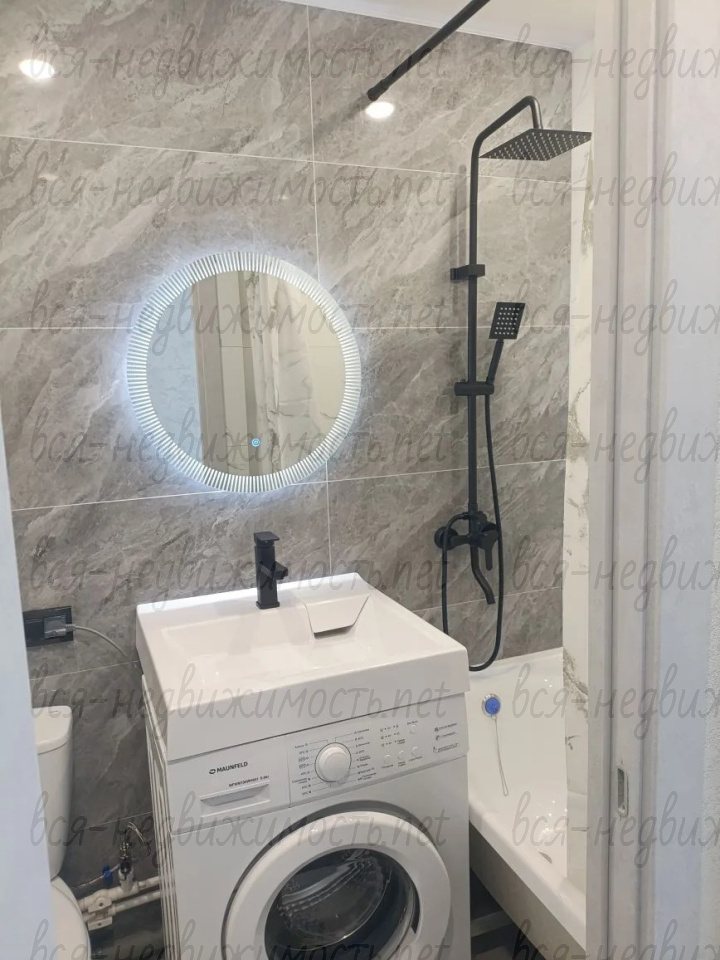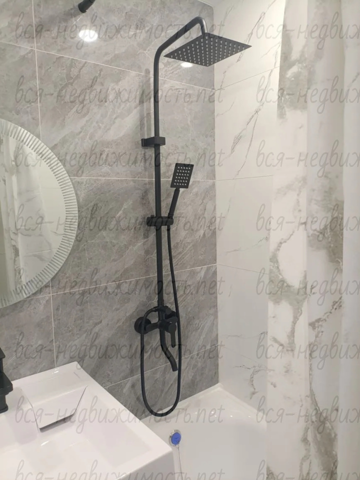 Санузел совмещённый, акриловая ванна, душ- система с тропическим душем 3 в1, зеркало с подсветкой, умывальник над стиральной машиной, покрытие керамогранит, шумоизоляция стен , гидроизоляция всего помещения, натяжной потолок.