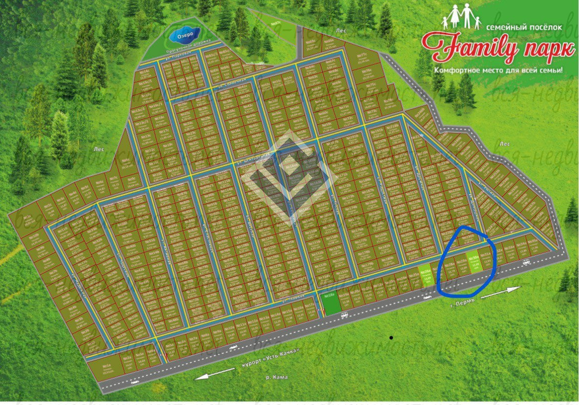 Участок ровный, прямоугольной формы, размер 12.99 соток., категория ИЖС. Асфальтовая дорога (Пермь-Усть-Качка) до въезда в поселок, далее до участка ровная грунтовка. Установлен забор из металлопрофиля с 2-х сторон.