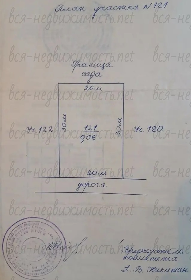 Участок правильной формы, в длину 30м, в ширину 20м, итого 600 кв.м. Из построек: две теплицы, и небольшой сарай для хранения хозинвентаря.