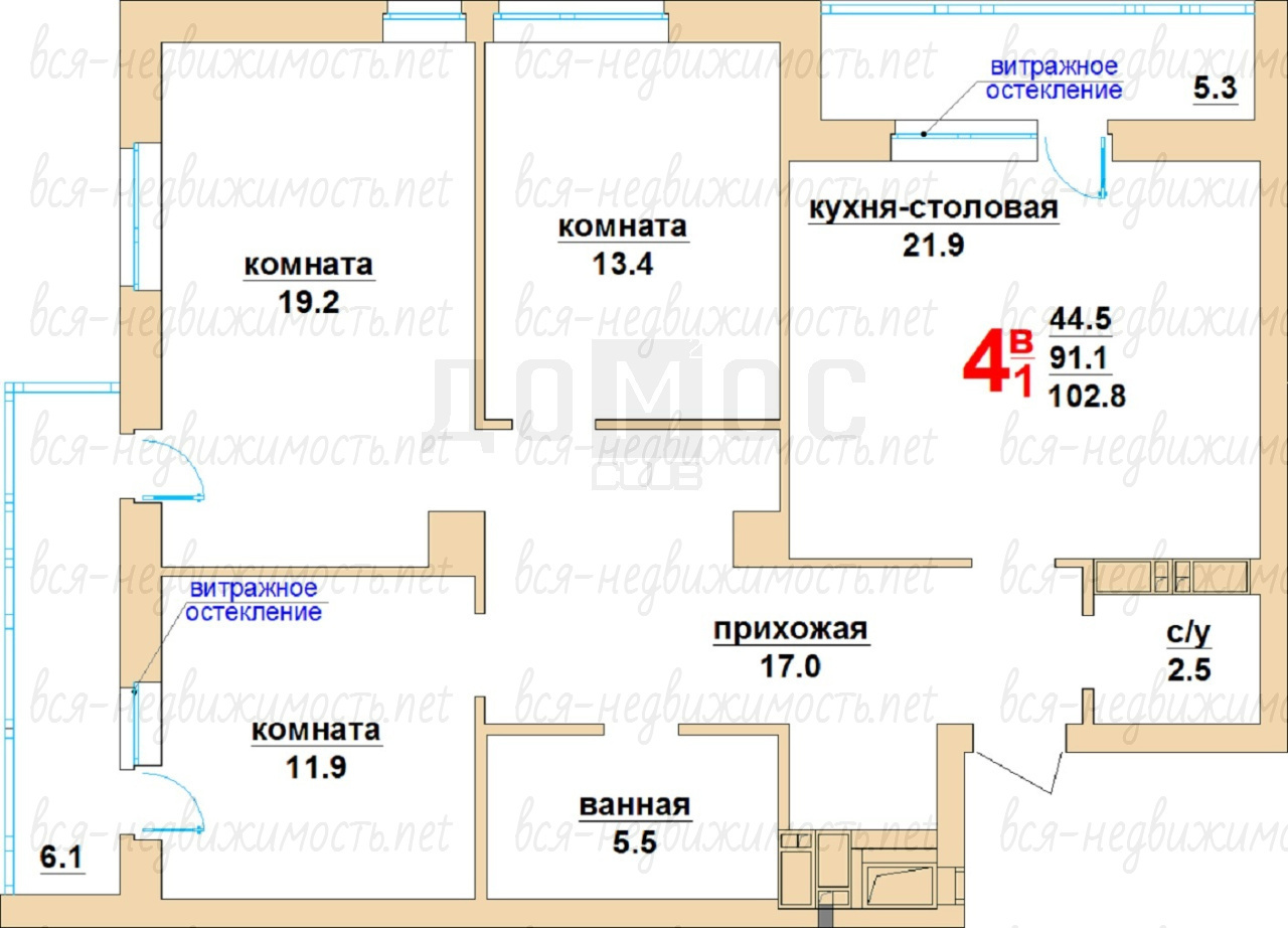 Общая площадь 91,1 кв.м позволяет разместить большую семью или обустроить рабочий кабинет.