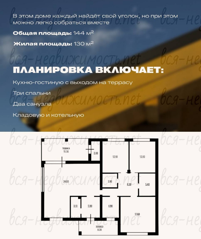 Просторная кухня-гостиная, мастер-спальня, ещё 3 комнаты, терраса, котельная. Панорамные окна.