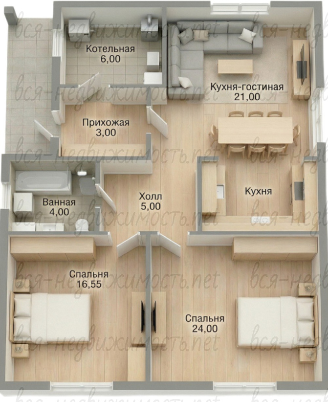 Данный дом площадью 74 м.кв, две просторные спальни 24 и 16,5 м.кв., кухня-гостинная 21м.кв., просторный санузел, техническое помещение. На данном этапе возможно согласование планировки индивидуально.
