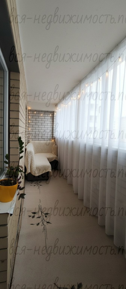 Главная особенность квартиры — огромная лоджия, которая выходит и на кухню, и на комнату. Это пространство можно использовать как небольшую зону отдыха, рабочий кабинет или место для цветов и уюта.