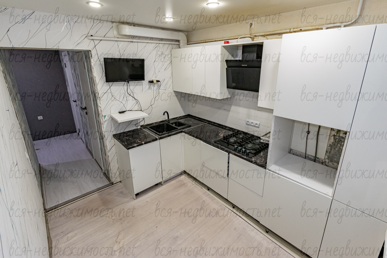 - кухонный гарнитур с встроенной техникой: варочная поверхность, посудомойка, вытяжка, телевизор