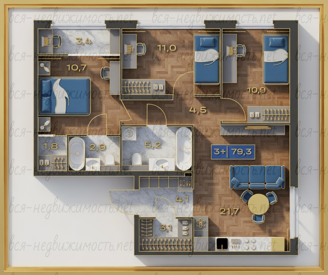 Квартира расположена на 7 этаже (из 25) в доме, который сдаётся в 2026 году. Площадь — 79,3 м², продуманная современная планировка с просторной кухней-гостиной 21,7 м², мастер-спальней, гардеробной и постирочной. Есть два санузла и тёплая лоджия.