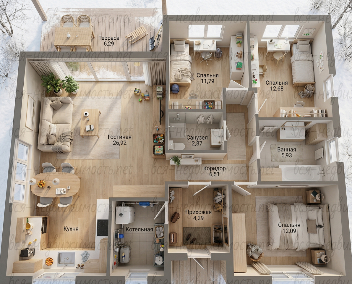 - 3 отдельные комнаты— просторные спальни (12,09 м², 11,79 м², 12,68 м²) они для ваших идей — гостевая, кабинет или детская.