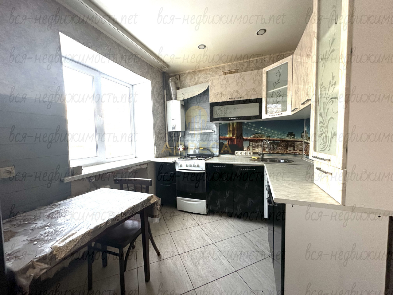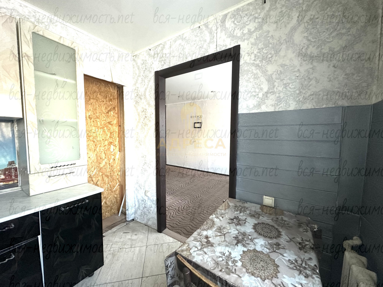 Кухня укомплектована, на полу плитка, ниша для холодильника,