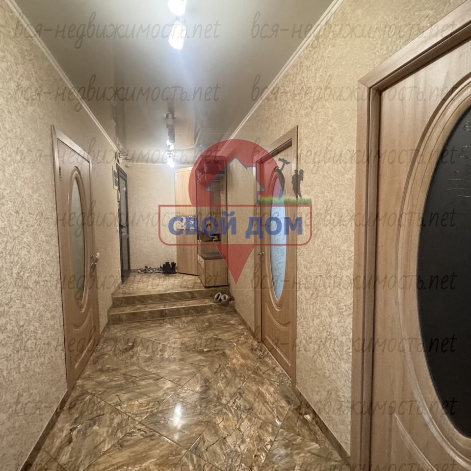 В коридоре, в ванной и на кухне кафель, в зале и спальных комнатах ламинат. Хорошего качества входная дверь и межкомнатные двери (покупали в магазине " Царь дверей").