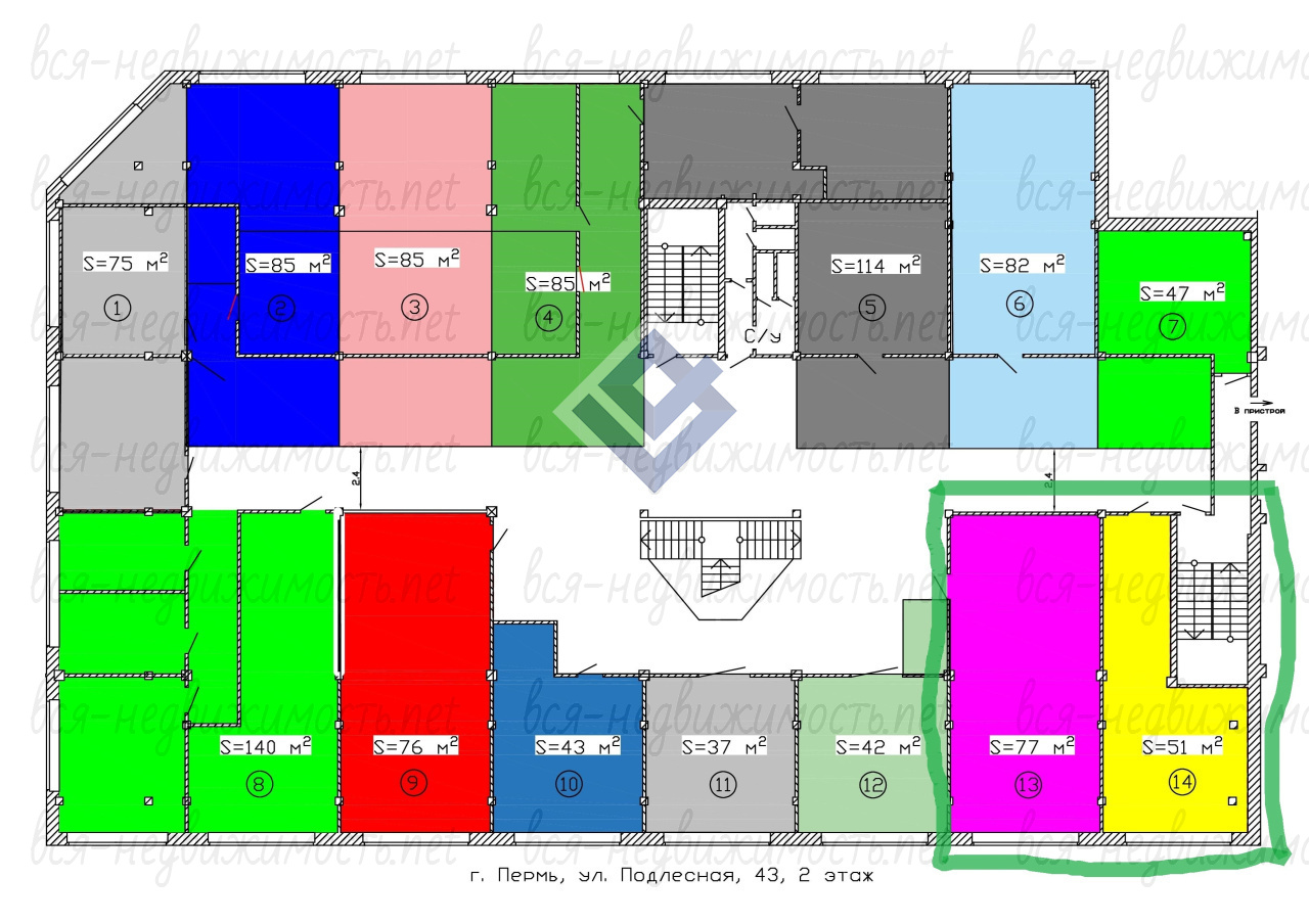 Предлагается к продаже помещения №13 и №14 (на схеме этажа) общей площадью 128 м2 на 2 этаже в
