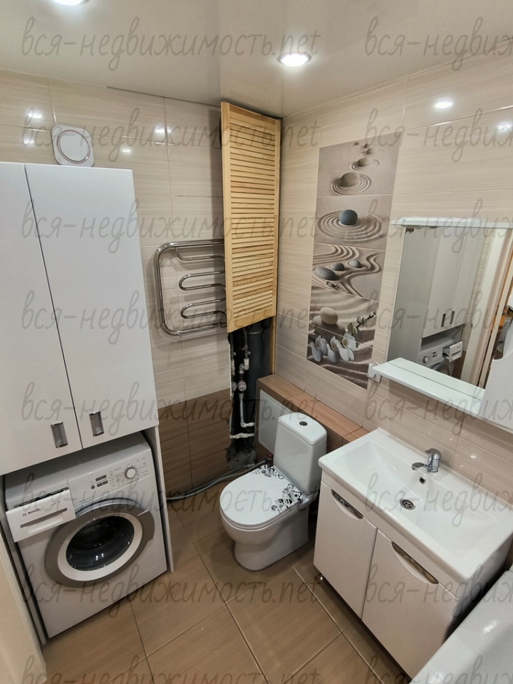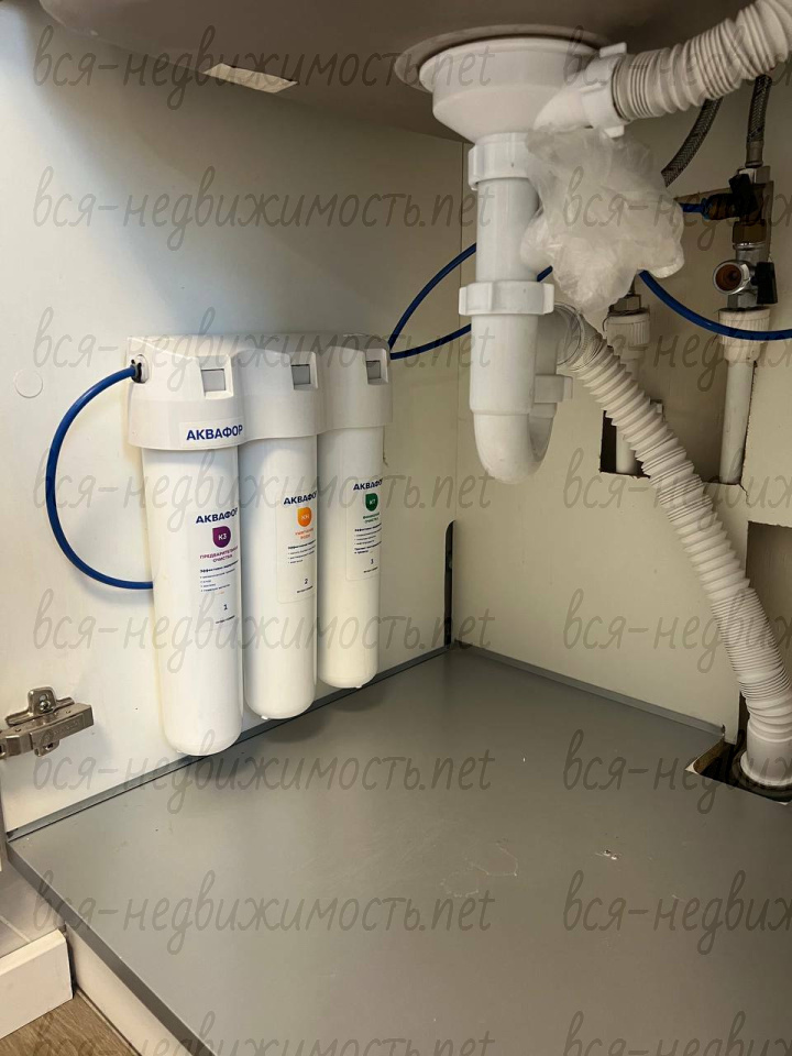 В ванной комнате установлен вместительный шкаф со стиральной машинкой. Есть фильтры на воду (ГВС и ХВС). Теплый пол.