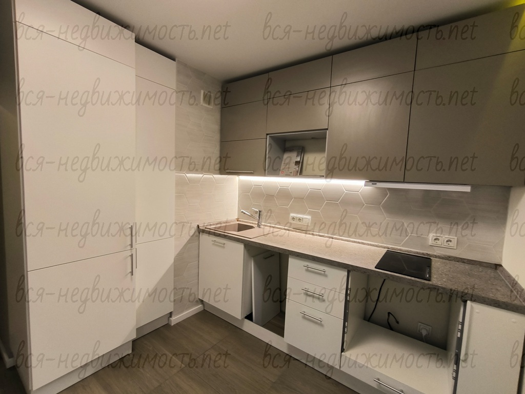 Просторная кухня площадью 8,6 кв.м. На кухне установлен качественный кухонный гарнитур «Мария», со встроенным холодильником и варочной поверхностью. Для питьевой воды на кухне установлен дополнительный фильтр «Аквафор». На полу керамогранит с подогревом.