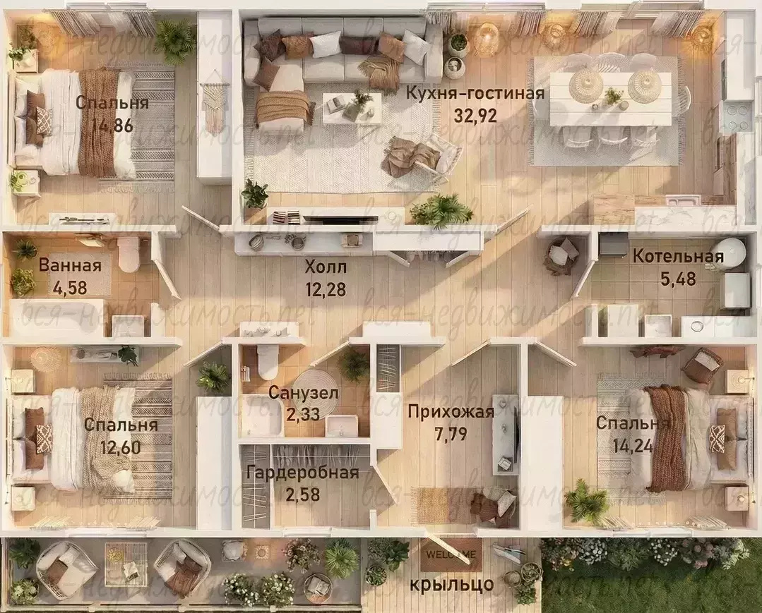 В доме три светлые спальни (14,86 м², 14,24 м², 12,60 м²), две просторные ванные комнаты (4,58 м² и 2,33 м²), гардеробная зона (2,58 м²), чтобы порядок и уют всегда были в вашем доме. Большой зал (32,92 м²) встречает гостей светом и уютом с первых минут. Котельная (5,48 м²) — максимальная технологичность и автономность, гарантия надежности.