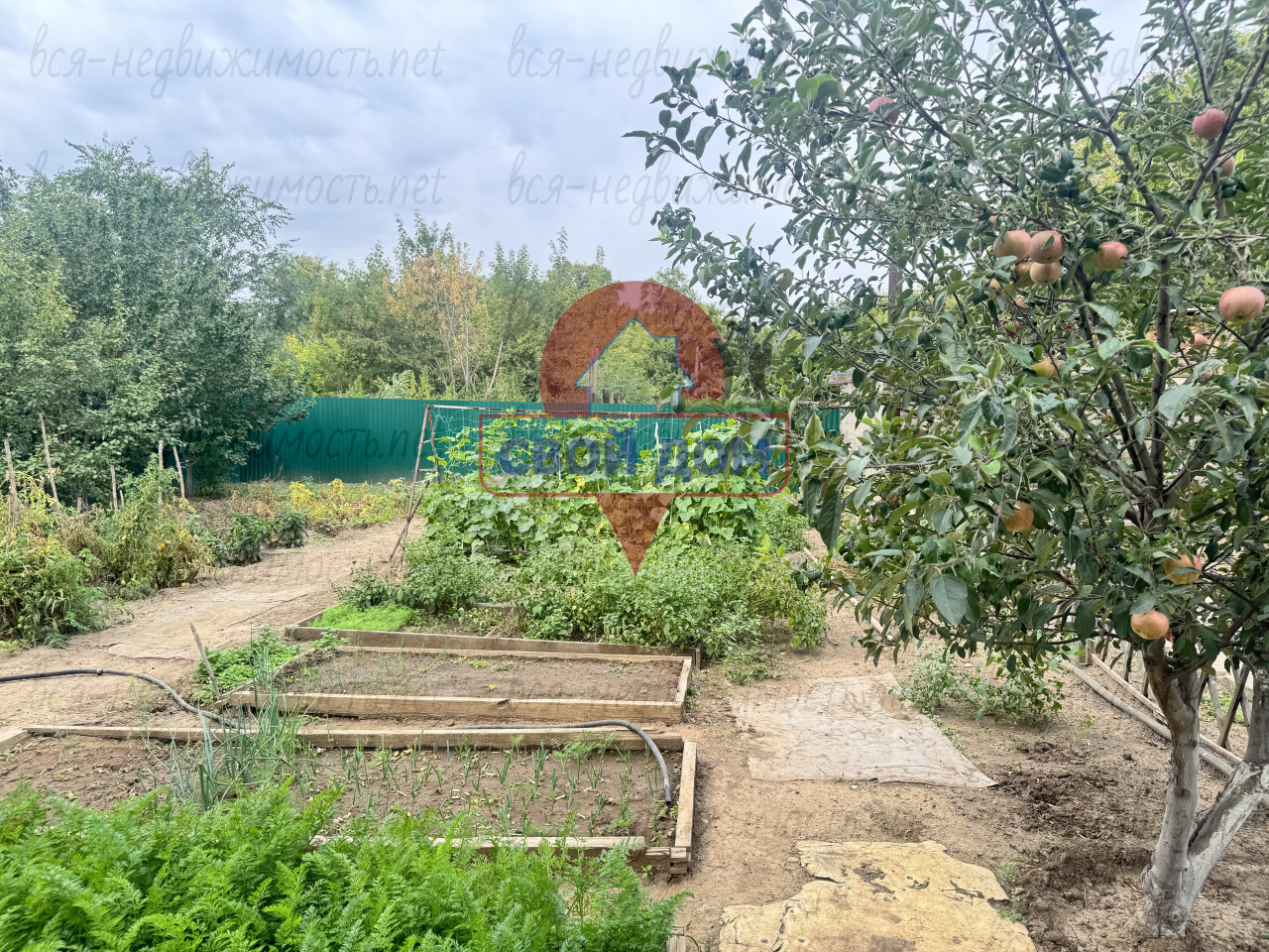 В огороде насаждения: груша, абрикос, вишня, яблоня виктория.