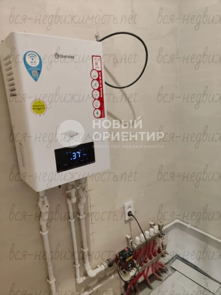 Установлен хороший электрокотел. Смонтирован водяной "теплый пол" по всей площади дома.