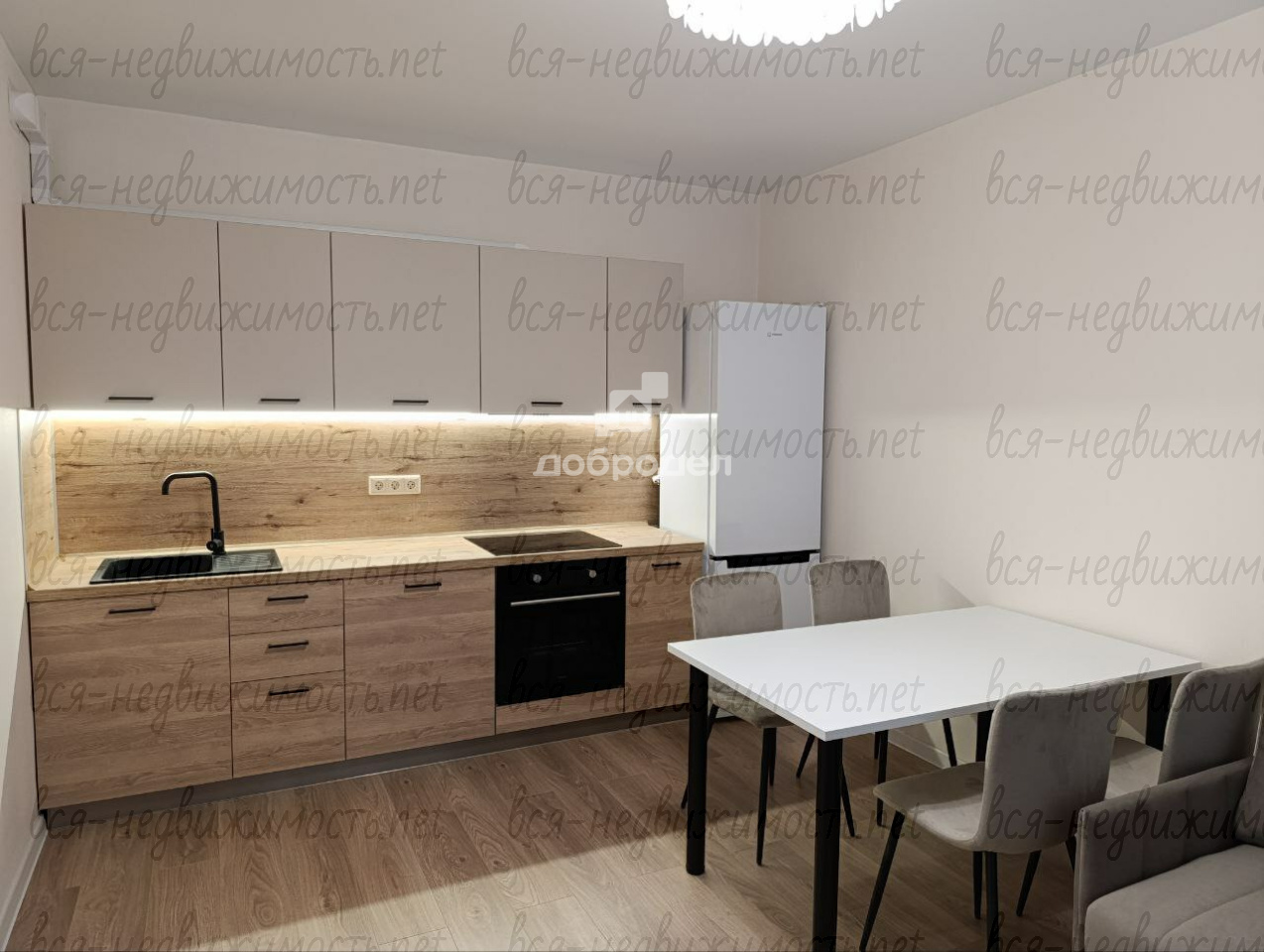 варочной поверхностью, жарочным шкафом, вытяжкой, а так же холодильник, диван, тумба, кухонный стол и стулья.