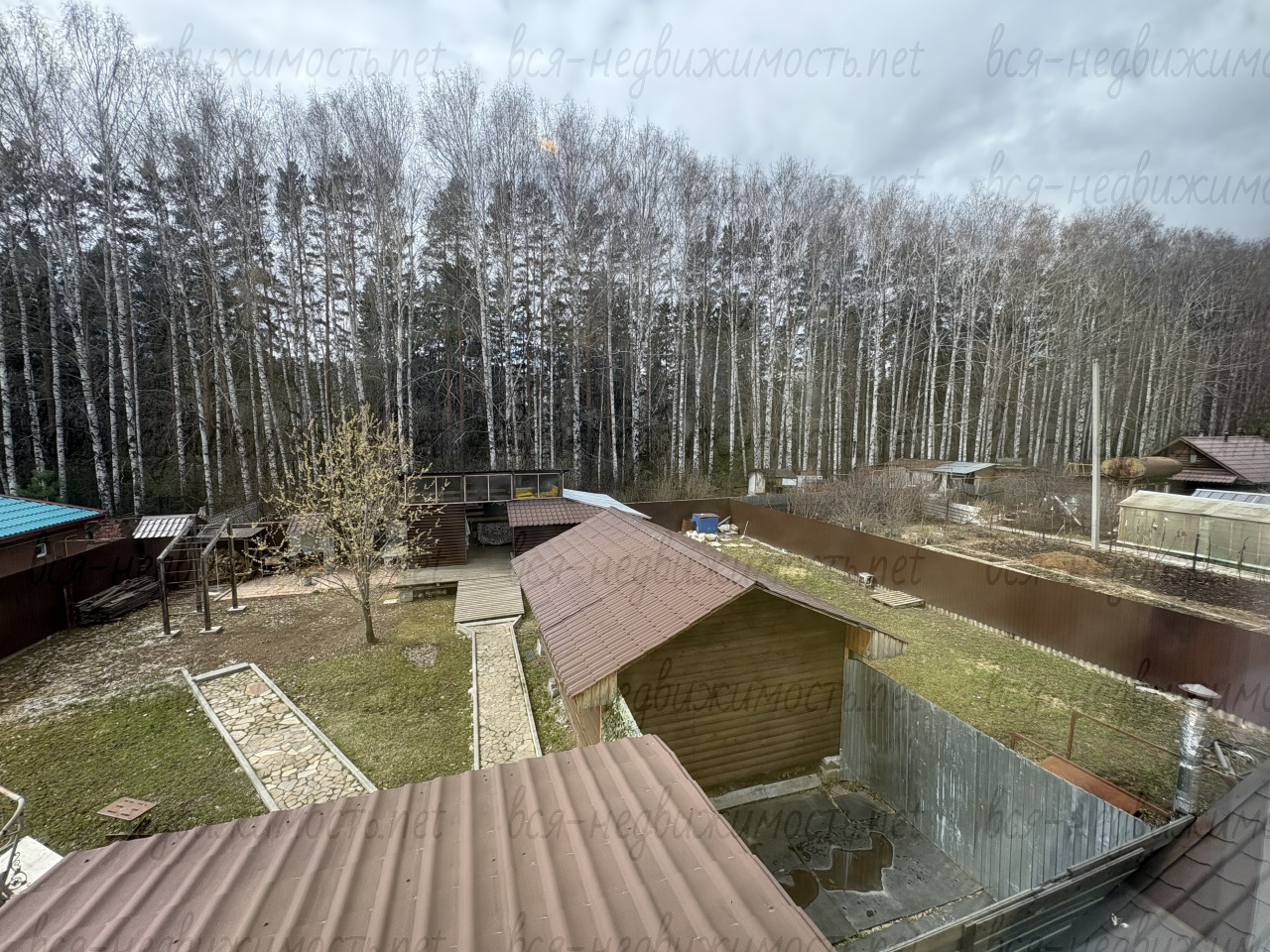Слева заезд на участок через ворота, справа от коттеджа находится гараж (крытый, на 4-5 машин). За забором – березовая роща, смешанный лес. .