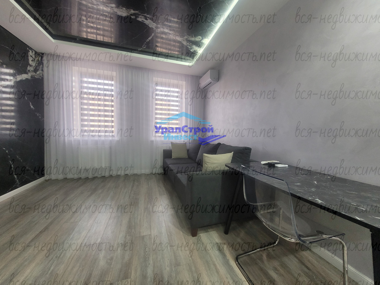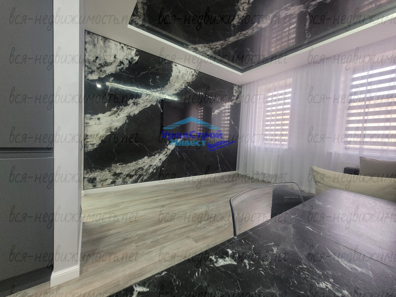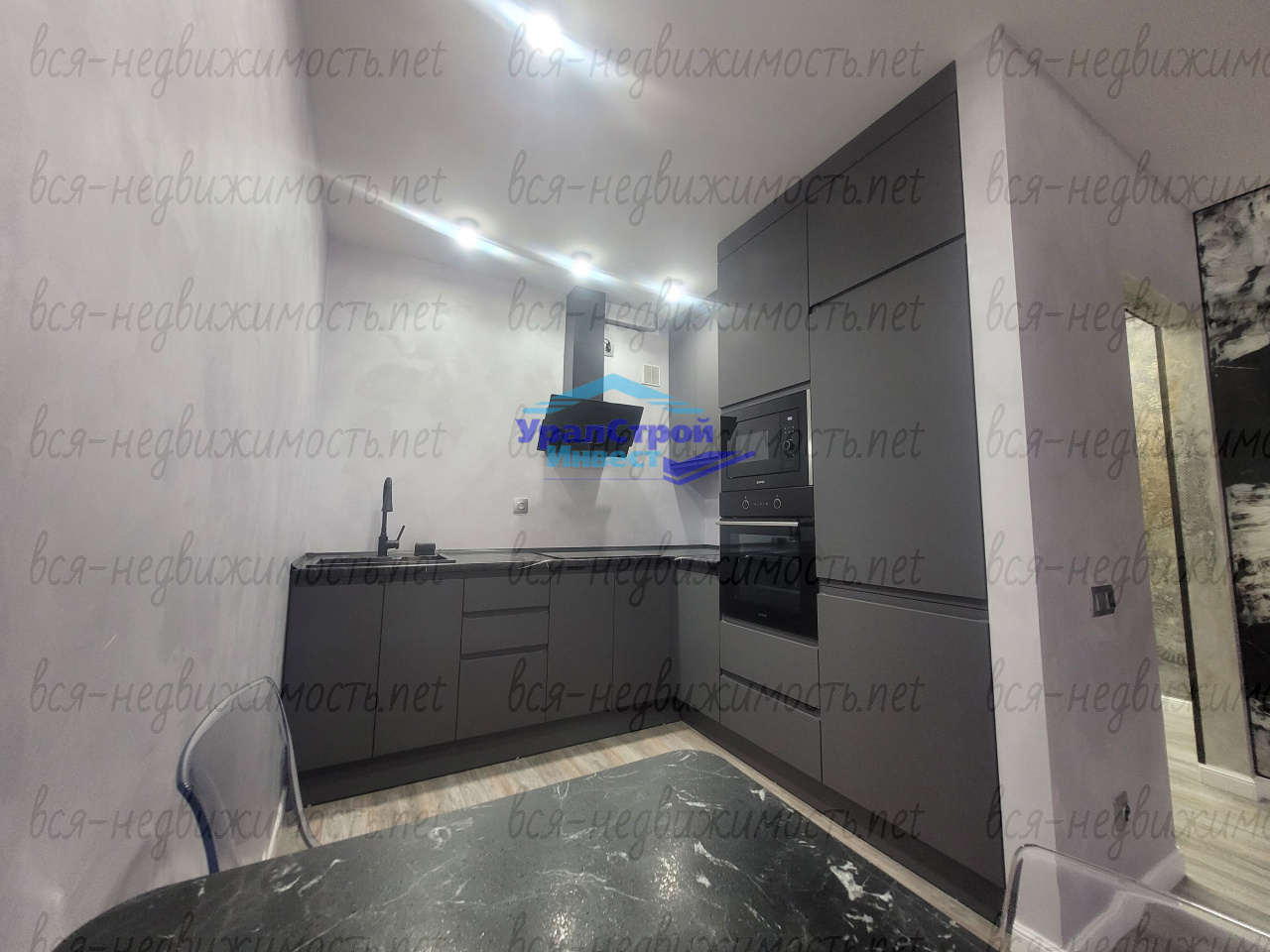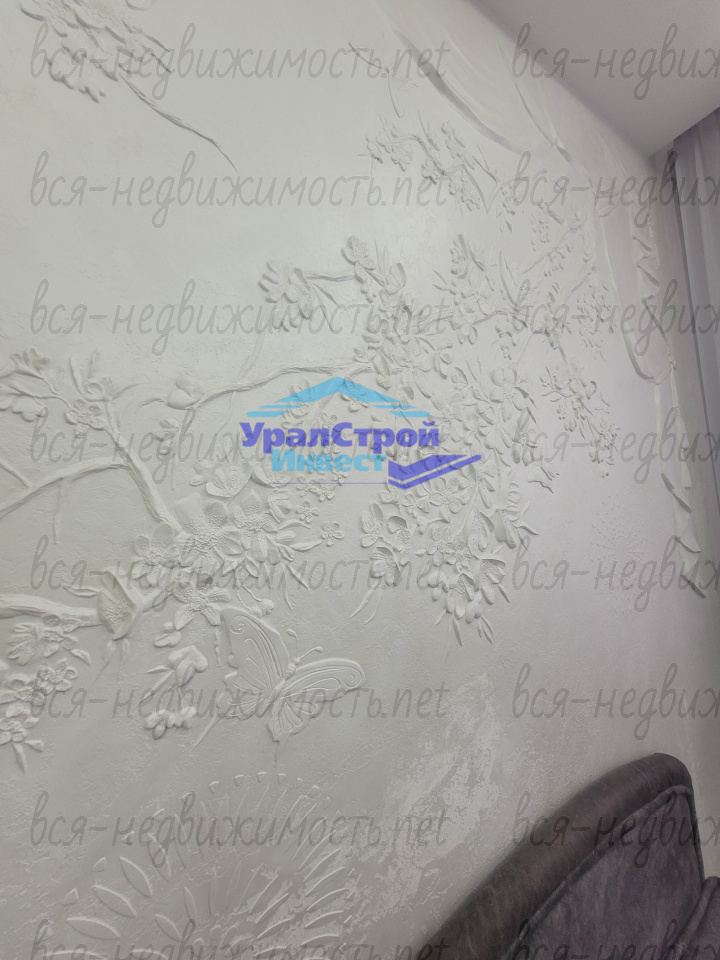 Гостинная оформлена с использованием эксклюзивной штукатурки на стенах и потолке. В зоне кухни установлен современный кухонный гарнитур со встроенной техникой, которая остаётся новому хозяину.