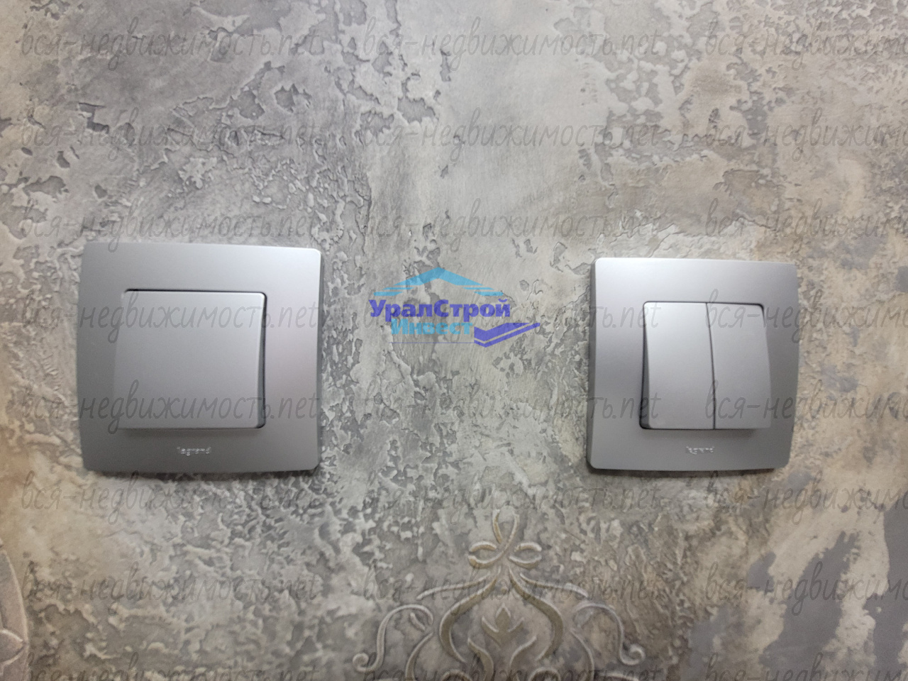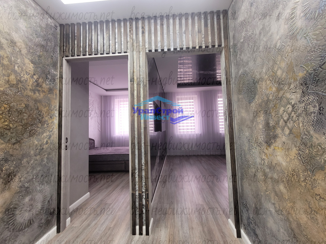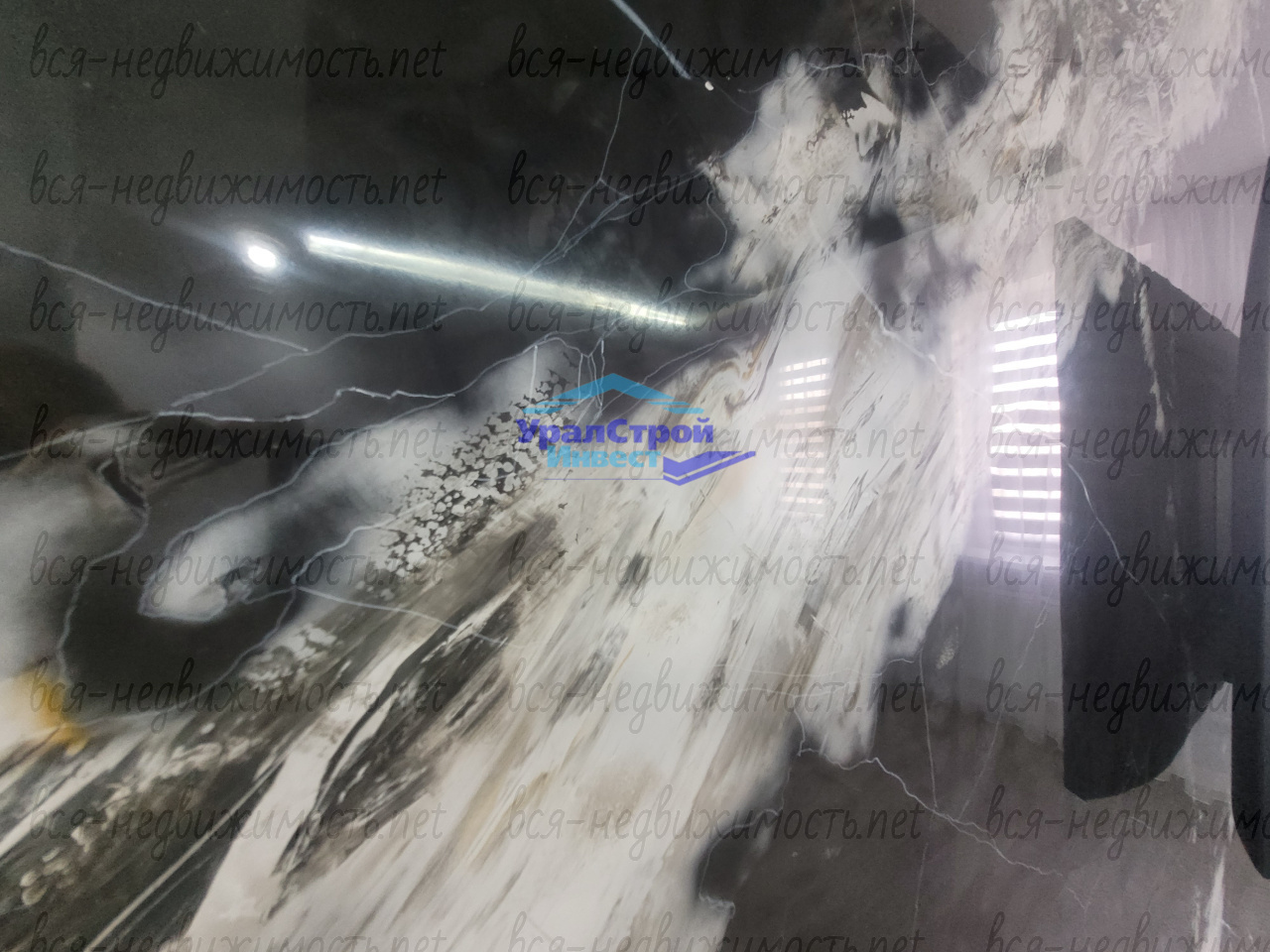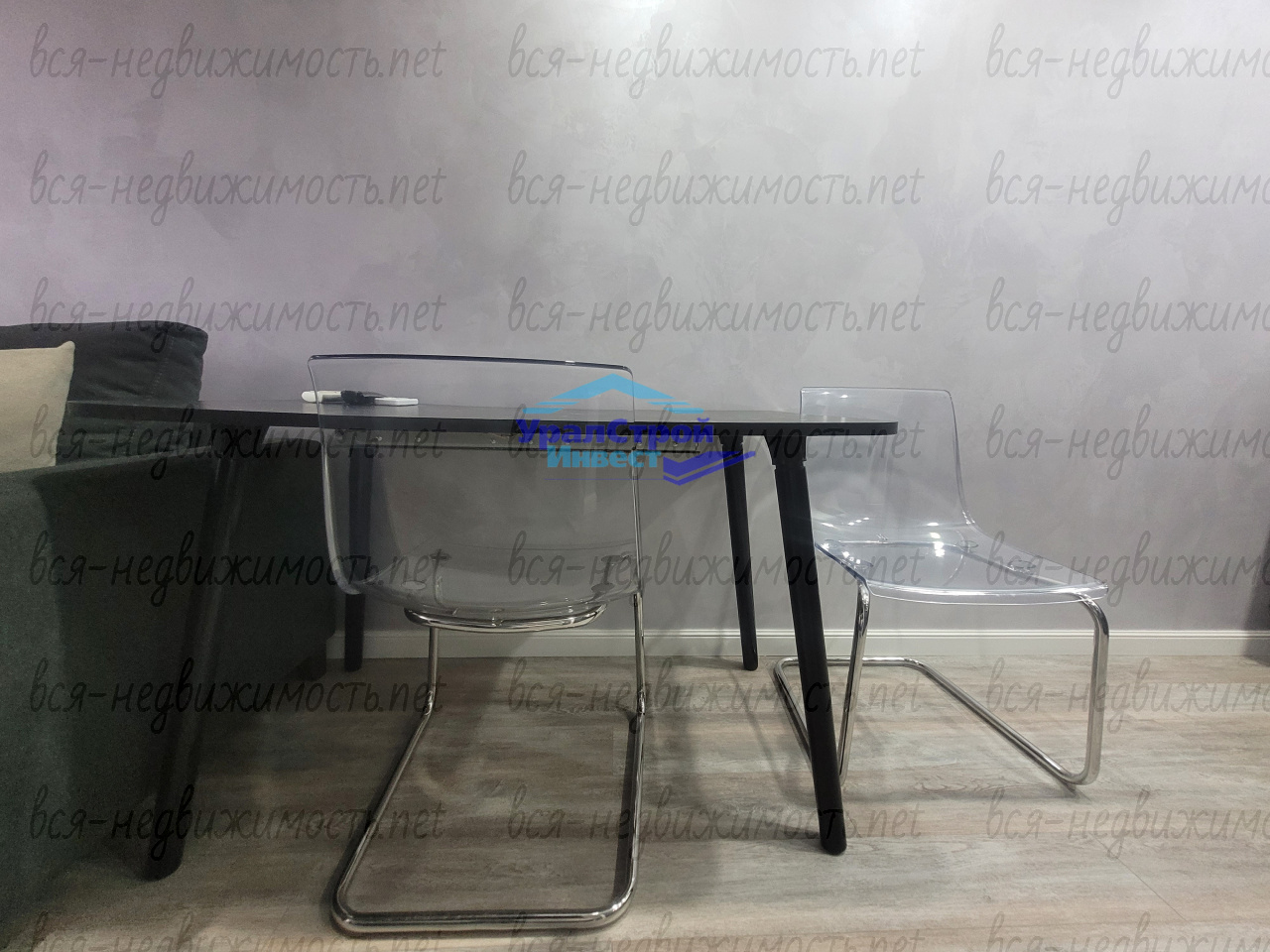 Гостинная оформлена с использованием эксклюзивной штукатурки на стенах и потолке. В зоне кухни установлен современный кухонный гарнитур со встроенной техникой, которая остаётся новому хозяину.