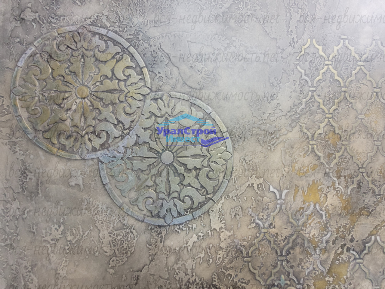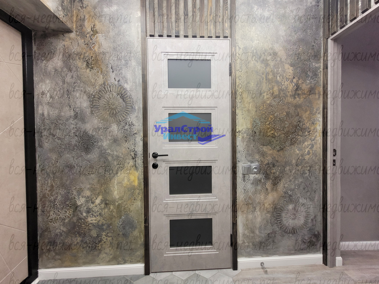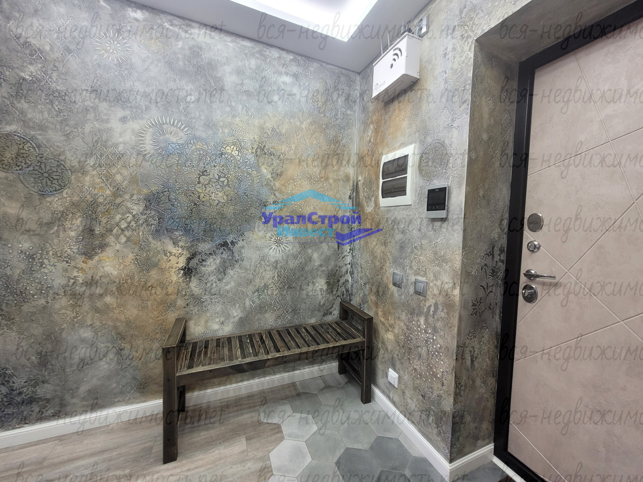 На стенах прихожей красивая декоративная штукатурка выполненная ручным методом с использованием трафаретов.