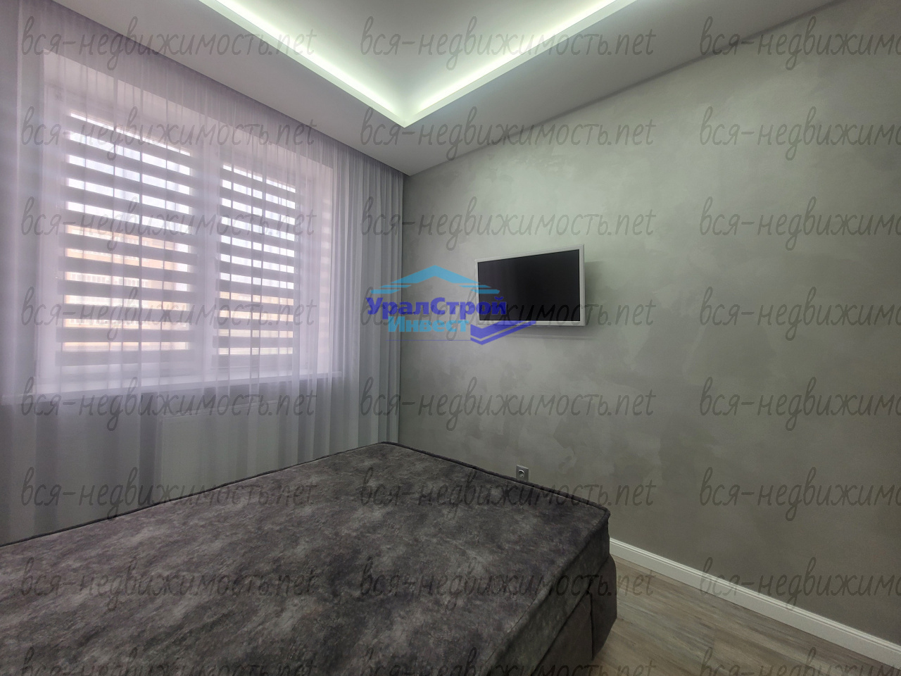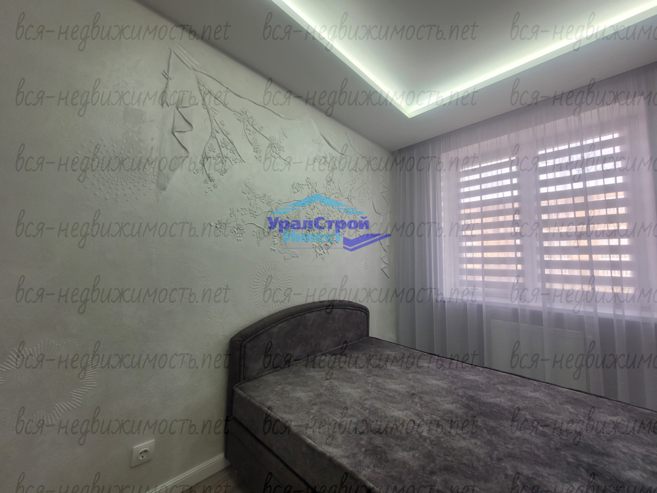 Уютная спальня оборудована встроенным шкафом-купе, также остающимся в квартире. Особое внимание привлекает стена над изголовьем кровати, оформленная красивой лепниной ручной работы.