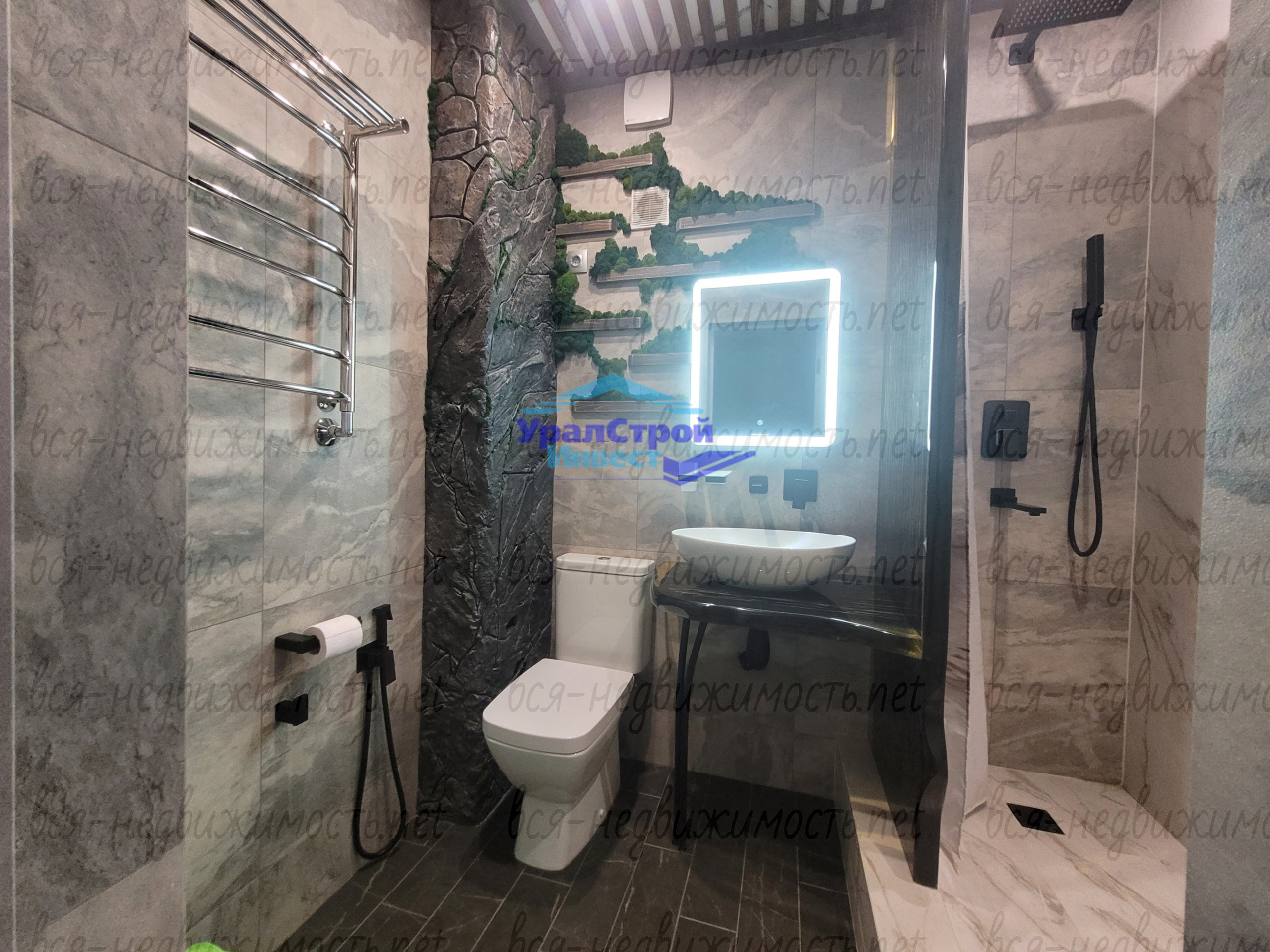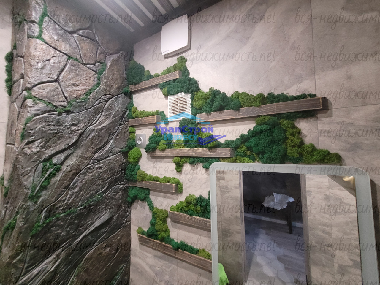 Совмещённый санузел порадует своим стильным дизайном: натуральный мох на стенах придаёт свежесть и создаёт атмосферу лета даже в хмурые осенние и зимние дни. Душевая перегородка и столешница под раковиной выполнены как настоящие шедевры ручной работы.