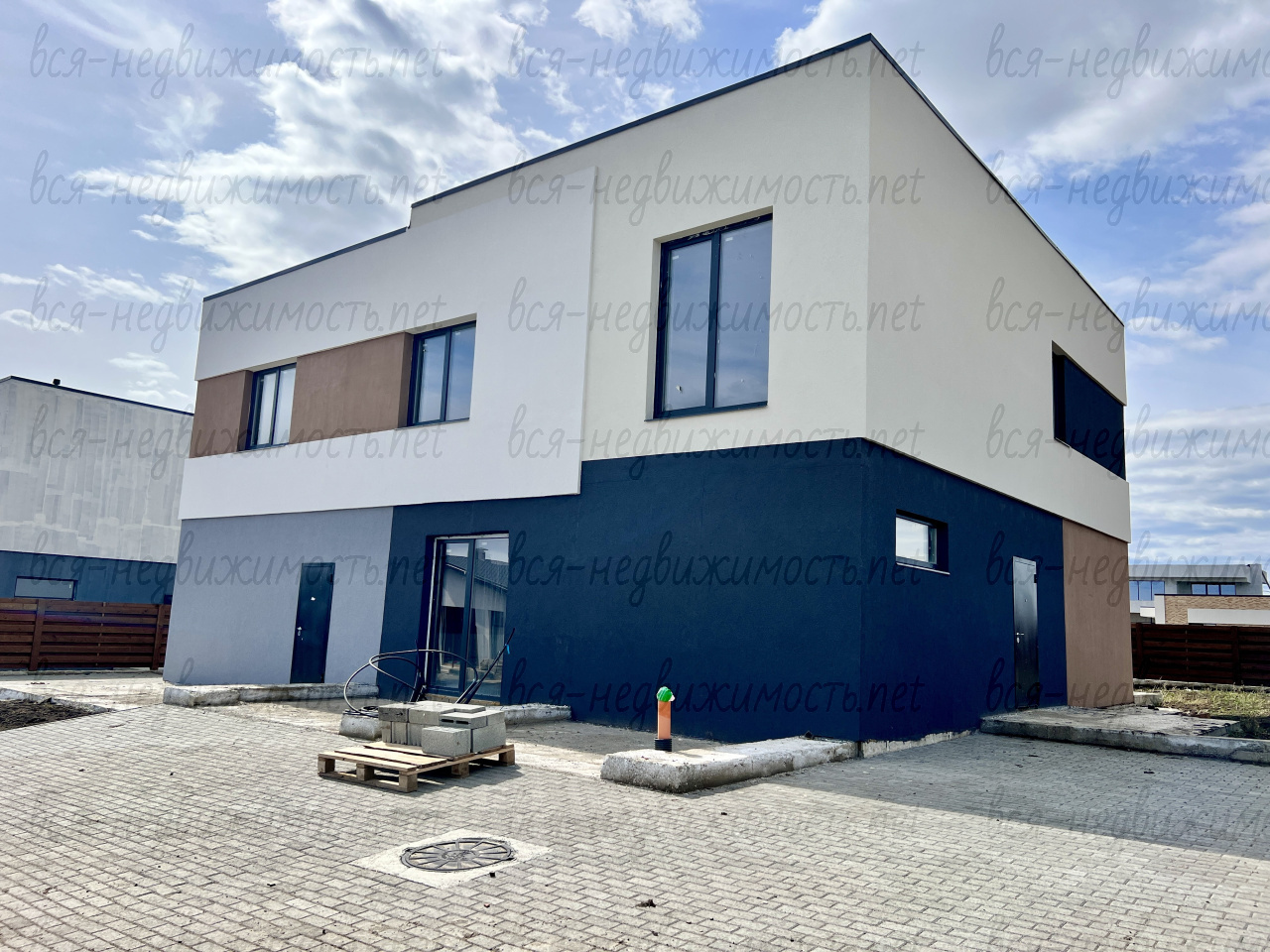 Современная архитектура: строгие линии, большие окна, много света.