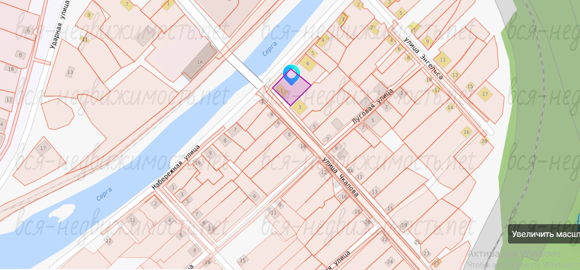Участок 12 соток, проведено межевание. Через дорогу, в 50 метрах, протекает река Серга, рядом лес, до дома асфальтовая дорога. Участок угловой, удобный заезд на участок.
