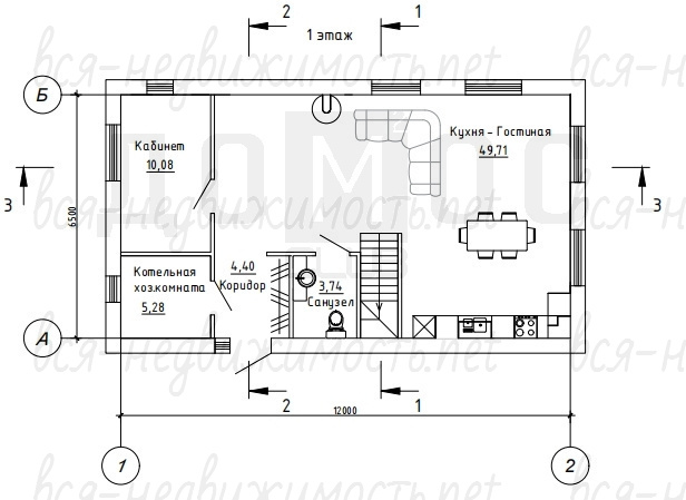 1й этаж - просторный холл, большая кухня-гостиная 50 квадратных метров с панорамными окнами «в пол» и высокими потолками, гостевая комната, санузел и котельная.