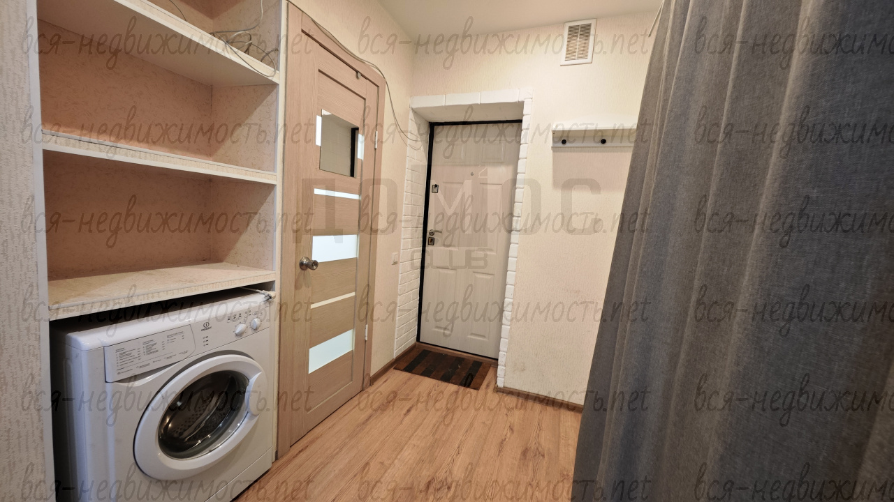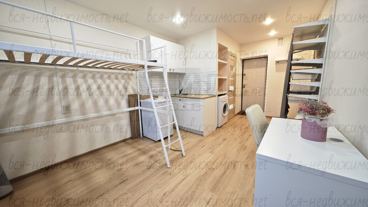 Всё своё и всё под рукой: санузел, кровать, стиралка, холодильник, кухонный гарнитур и продуманная гардеробная система хранения. Пространство компактное, но очень комфортное и аккуратное — заезжай и живи!