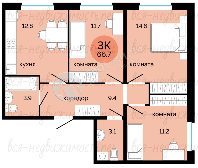 Классическая трехкомнатная квартира, комнаты правильной формы, 2 санузла, просторная кухня, достаточно мест для хранения.