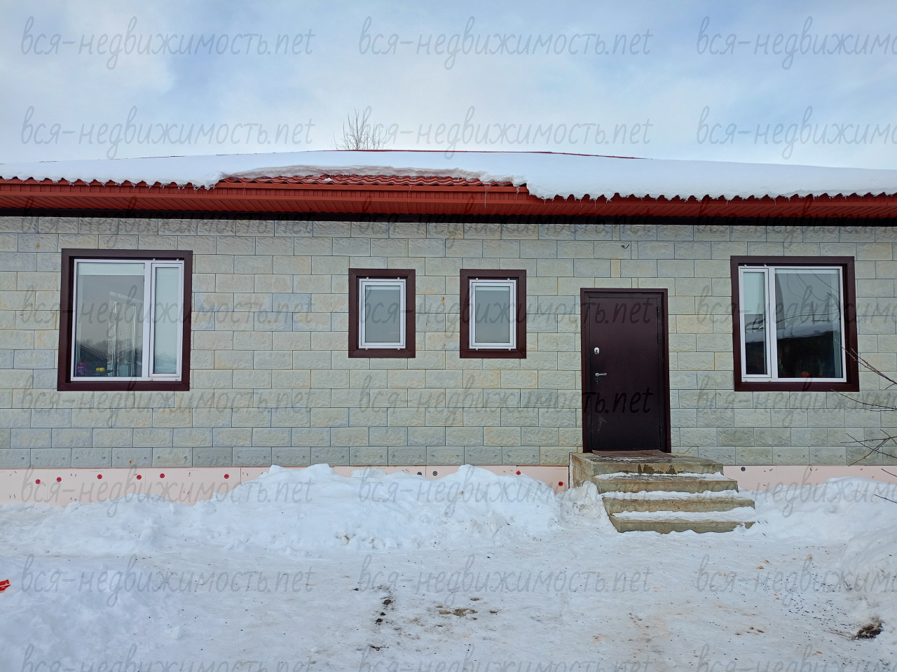 фасад выполнен из утепленной плиткой под камень (утепление 50 мм.), стены отштукатурены с двух сторон; окна 70 профиль, 3 стекла энергоэффективные.