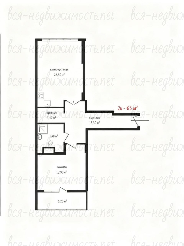 - Кухня‑гостиная: 28,5 кв.м.